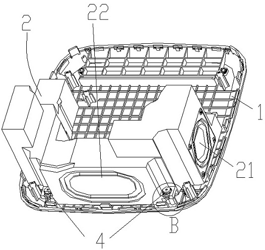 本实用新型涉及一种投影仪喇叭模组结构,包括投影仪壳体以及设置于投影仪壳体内部的喇叭组件,喇叭组件的四角位置均设置有软胶垫,螺钉依次贯穿软胶垫和投影仪壳体,所述喇叭组件包括分别设置于壳体两侧部的喇叭,两个喇叭之间前、后设有用以提高声音效果的被动盆。本实用新型结构简单,设计巧妙,能够有效避免喇叭与投影仪壳体刚性固定,避免与投影仪壳体产生共振问题;同时,该喇叭组结构设计合理,有利于声音均匀播放且声音效果佳。