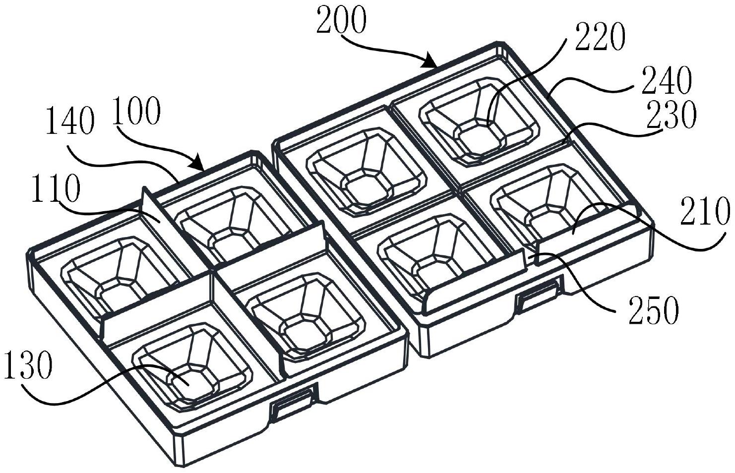本实用新型涉及厨具技术领域,公开了一种三明治烤盘,所述三明治烤盘包括,上烤盘,所述上烤盘设置有切割件、卡槽和至少两个第一凹槽;所述切割件位于两个相邻的所述第一凹槽中间的位置,隔离两个相邻的所述第一凹槽;所述卡槽位于所述上烤盘靠近一侧侧边位置;下烤盘,所述下烤盘上设置有导向件,所述导向件位于所述下烤盘靠近一侧侧边位置;在所述上烤盘扣合到所述下烤盘上时,所述导向件所在侧边与所述卡槽所在侧边互相对齐,所述导向件的顶端插入到所述卡槽内。本实用新型一次能够加工获得多种口味的小块三明治,三明治烘烤完成后无需再进行手工切割。