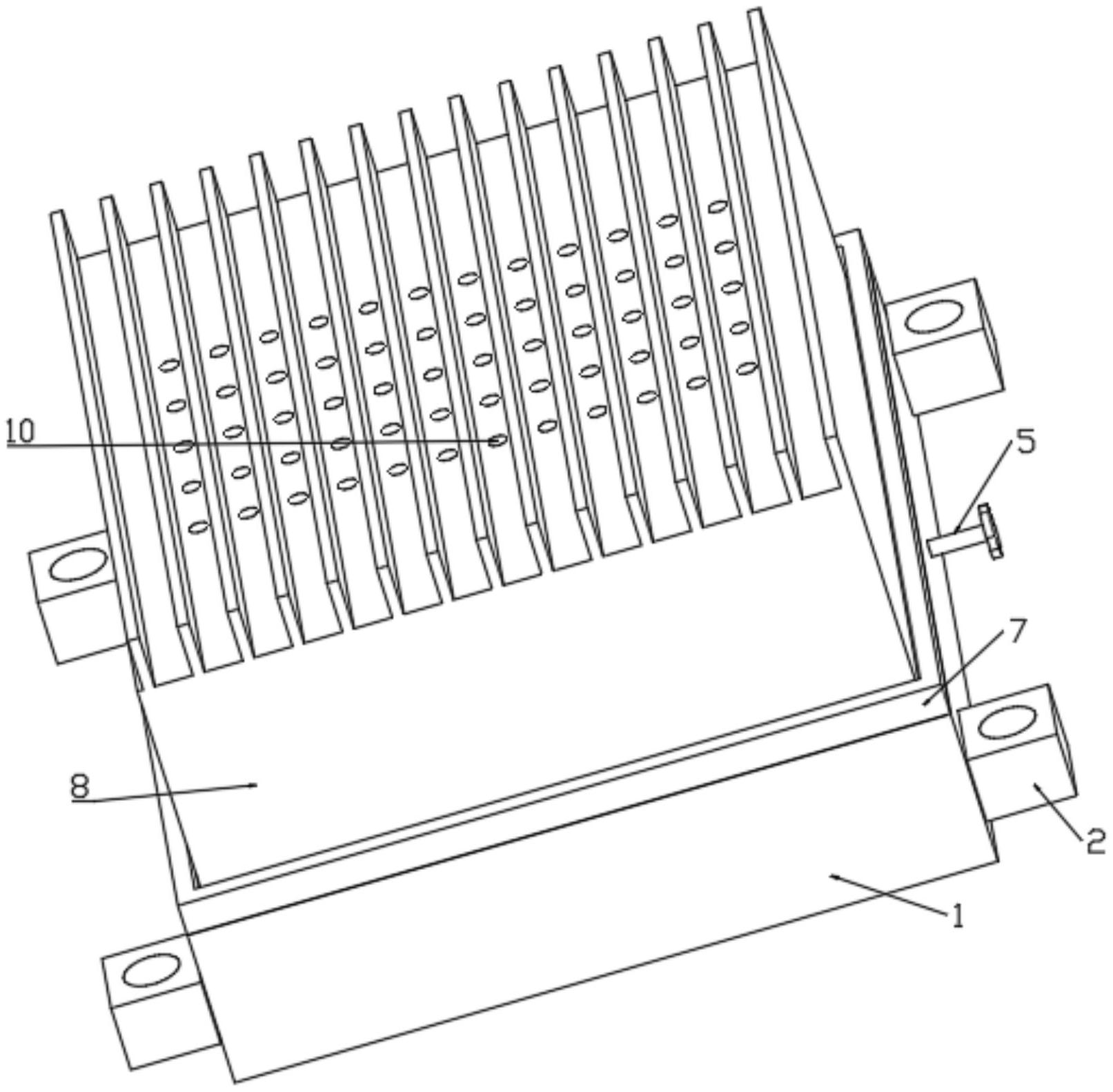 本实用新型公开了一种散热器外壳的安装结构,包括安装座,所述安装座四周均固定连接有安装凸块,所述安装座一侧均匀的设置有进风孔,所述安装座上端面均设置有排风孔,所述安装座内腔安装有锁扣装置,所述安装座内腔底部安装有散热装置,所述安装座上端面固定连接有矩形框,所述安装座上端面安装有散热器外壳,所述散热器外壳下端面四周均固定连接有挂钩,所述散热器外壳上端面均设置有散热孔,本实用新型涉及散热器外壳安装技术领域。该散热器外壳的安装结构,解决了传统的散热器外壳散热效果不佳、且不便进行安装与拆卸的问题。