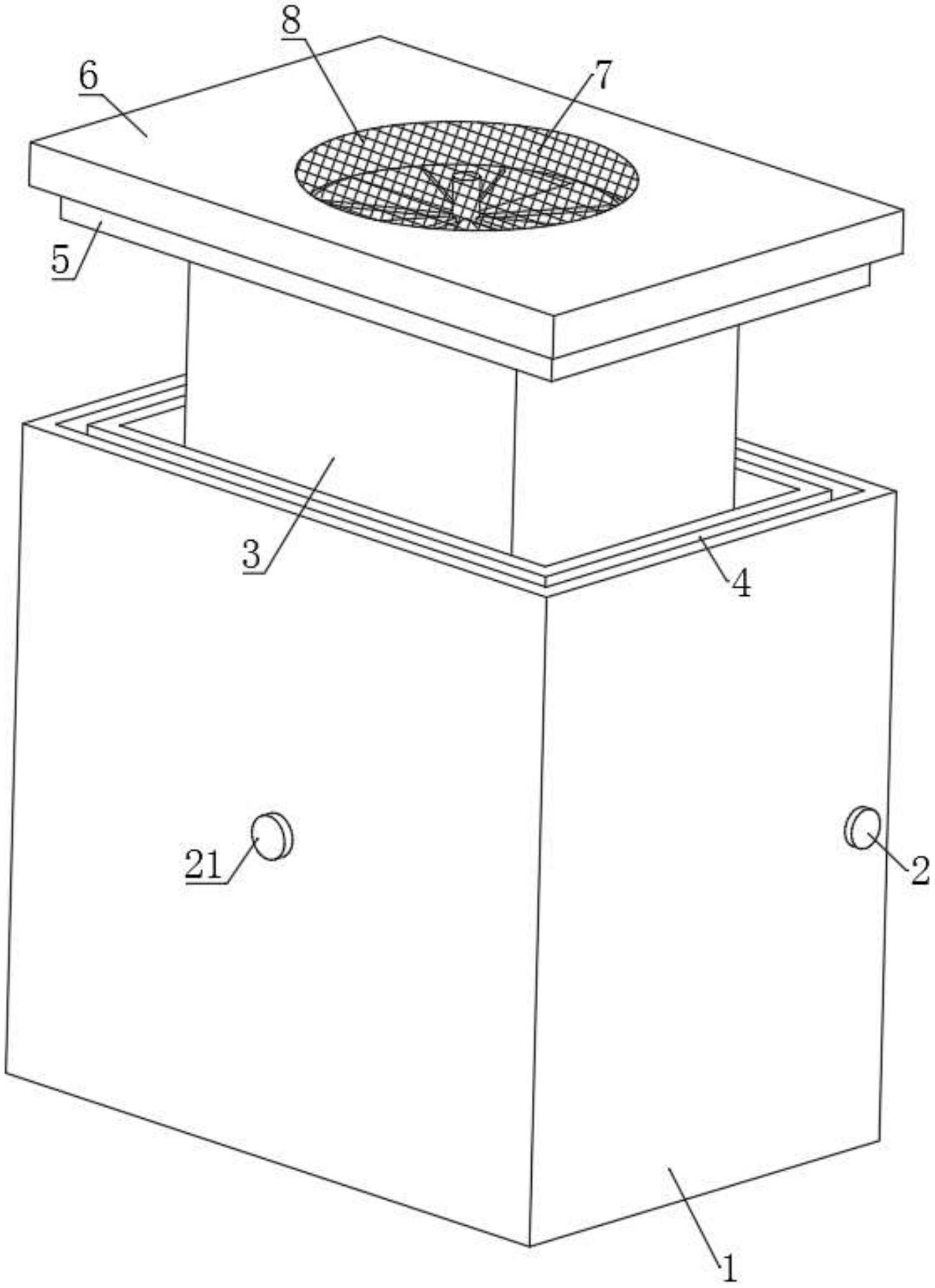本实用新型公开了一种新能源电池防护外壳,包括外壳,所述外壳上端面设置有密封槽,所述外壳内腔滑动连接有电池本体,所述外壳前端面设置有进水口,所述进水口内腔螺纹连接有固定塞,所述外壳内腔前有壁均设置有滑槽,所述外壳内腔左右壁均设置有收纳槽,所述滑槽内腔通过密封轴承分别转动连接有圆柱与双向螺纹杆,所述双向螺纹杆右端面固定连接有摇把。本实用新型涉及电池防护外壳技术领域。该新能源电池防护外壳,解决了现有电池防护外壳不便对电池主体进行夹持固定,不便对外壳内腔中的电池本体进行降温的问题。