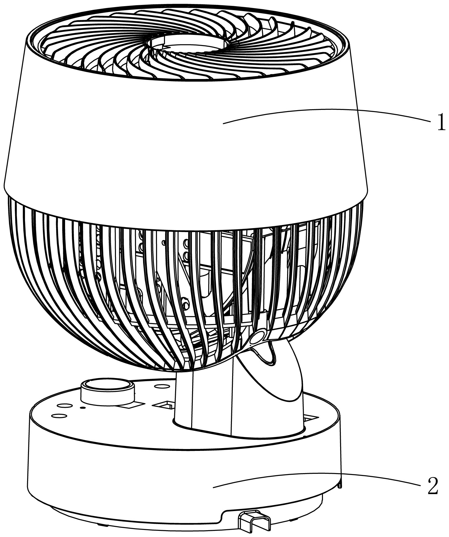 本实用新型公开了一种摇头循环扇,它的后通风球罩形成有缺口部,内壳的后部形成有凸弧形板部,凸弧形板部与缺口部位置对应设置,凸弧形板部与缺口部围成有弧形凹槽,底座包括支柱,支柱的顶部形成有插槽,支撑叉架包括插头部、右支臂及左支臂,右支臂的下端及左支臂的下端分别贴靠于插头部的左右两侧,插头部适配插装在插槽内,右支臂的下端部及左支臂的下端部都设置在插槽内,左支臂的上端及右支臂的上端分别铰接于内壳的左右两侧,左支臂的上端与内壳的铰接轴线沿左右方向延伸设置,支柱的上部设于弧形凹槽内,右支臂及左支臂穿过缺口部设置,支柱的上端部形成有前倒角部及后倒角部。本实用新型的循环扇清洁方便,结构稳固可靠。