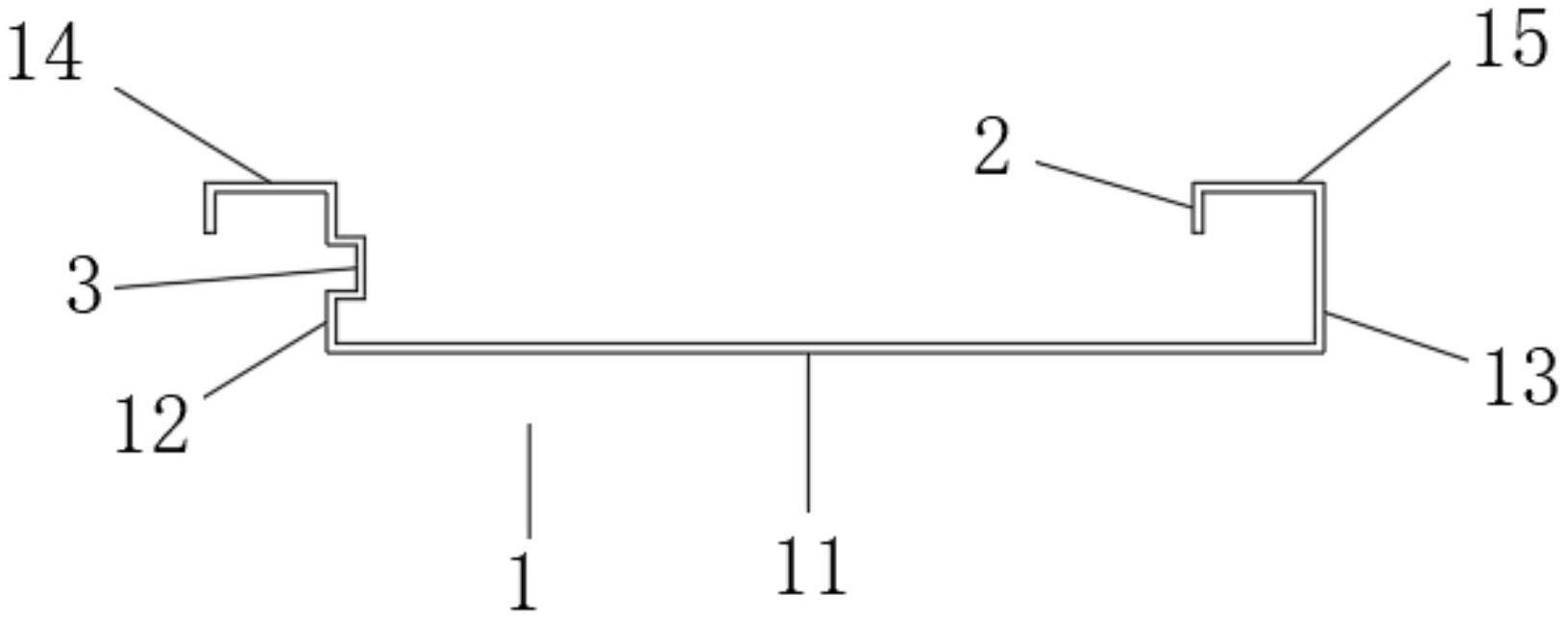 本实用新型公开了一种新型用顶材料G型加强结构,包括扣板本体,扣板本体为G型结构,扣板本体包括底板,底板的顶部两端分别固定连接有第一侧板和第二侧板,第一侧板远离第二侧板的一侧顶部固定连接有第一顶板,第二侧板靠近第一侧板的一侧顶部固定连接有第二顶板;第一顶板和第二顶板的底部且远离第二侧板的一端均固定连接有竖向板。本实用新型所达到的有益效果是:本实用新型结构紧凑,实用性强,通过在扣板本体的内侧顶部增加竖向面形成角,从而达到增加整体强度的作用,同时在不同的侧面设置槽型加强部进一步增加结构整体强度,从而解决了传统铝合金材质原材料受厚度影响不能制作长度较长或宽度较宽产品的局限问题。