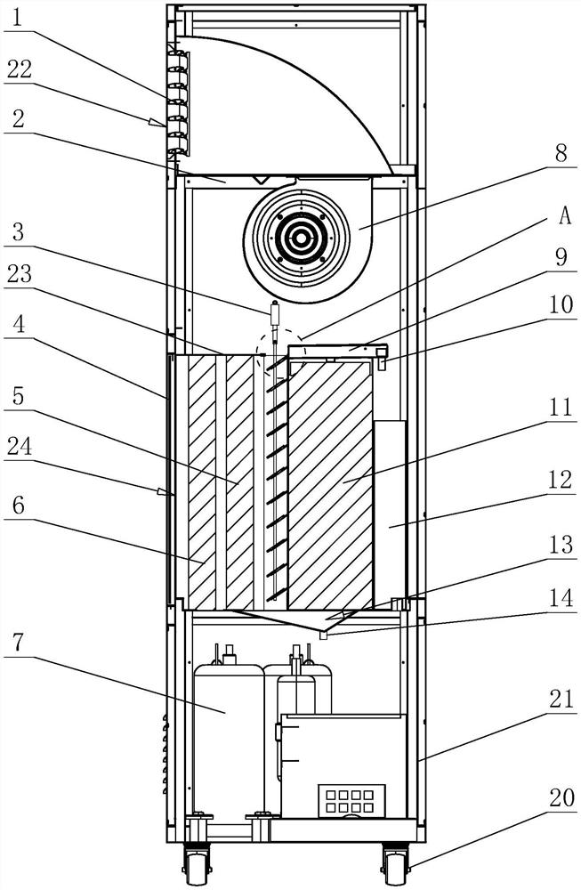 本申请涉及恒湿设备的领域,公开了一种便于调节湿度的恒湿机,其包括恒湿机本体,恒湿机本体上开设有出气口与进气口,恒湿机本体于进气口与进气口之间设置有用于加快空气流动速度的风机,恒湿机本体于进气口处设置有进气通道,进气通道内设置有用于除湿的蒸发器,进气通道远离进气口的一端设置有过水块,过水块上固定有淋水组件;进气通道靠近过水块的一端靠近两侧均设置有连接板,两个连接板之间转动连接有多个用于封闭进气通道的封板,封板上转动连接有用于连接多个封板的连接杆,恒湿机本体上设置有用于驱动封板转动的驱动件,进气通道上部与封板之间形成有使用封板进行关闭的通气口。申请具有提高恒湿机除湿的效果。