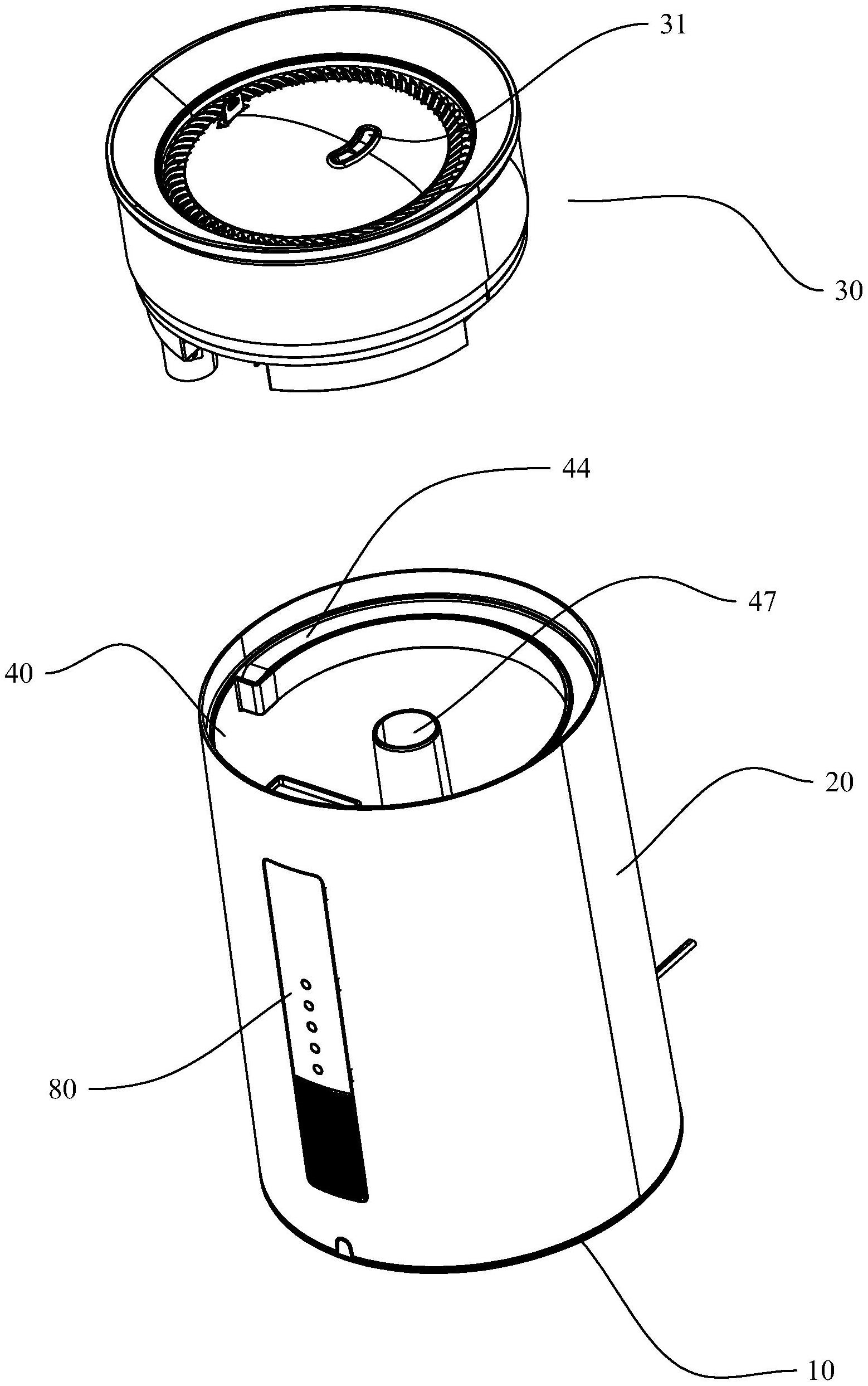 本实用新型公开了一种具有内置可拆水箱结构的加湿器,包括:基座、筒壳、顶盖组件、水箱组件、雾化头组件、下水控制组件及鼓风机;水箱组件可拆卸地放置于基座的上方,筒壳环设于水箱组件的外侧,顶盖组件壳盖合水箱组件;水箱组件设置有下水口,顶盖组件设置有出雾口,水箱组件设置有导雾筒,鼓风机可朝导雾筒送风。本实用新型,水箱组件内置于壳体内部,可维持水箱内水的干净整洁,并且通过拆卸顶盖组件,可直接朝水箱加水,也可提取水箱,将水箱挪至水龙头处进行加水,加水操作更加多样,操作简捷;并且,雾化头组件可选择超声波雾化单元和电热单元的一个或两个工作,用户可根据雾化需求进行选择,满足多种环境的使用需求。