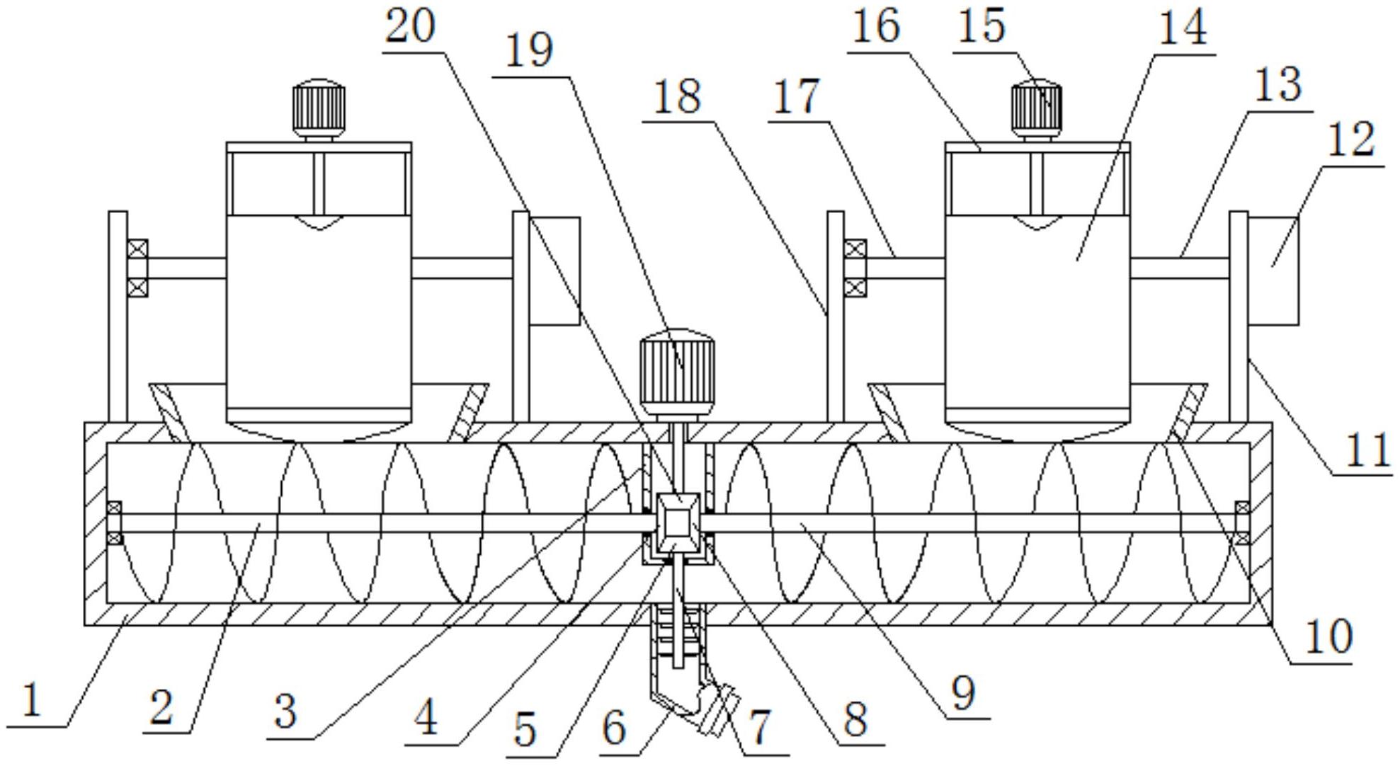 本实用新型公开了一种用于地暖铝塑复合管加工的混料装置,包括混料箱,所述混料箱顶端固定输入电机,所述输入电机的输出端穿入混料箱内并固定输入锥齿轮,所述输入锥齿轮下端两侧分别啮合进给锥齿轮一和进给锥齿轮二,所述进给锥齿轮一和进给锥齿轮二下端啮合输出锥齿轮,所述进给锥齿轮一一端固定进给轴一,所述进给轴一穿出安装箱并转动安装在混料箱内部左壁上,所述进给锥齿轮一端固定进给轴二,所述进给轴二穿出安装箱并转动安装在混料箱内部右壁上,所述混料箱下端中间位置设有输出管,所述输出锥齿轮一端固定输出轴,所述输出轴穿出安装箱后伸入输出管内,本实用新型实现单一动力输出,原料输送和混合稳定,具有辅助筛料和排料的功能。