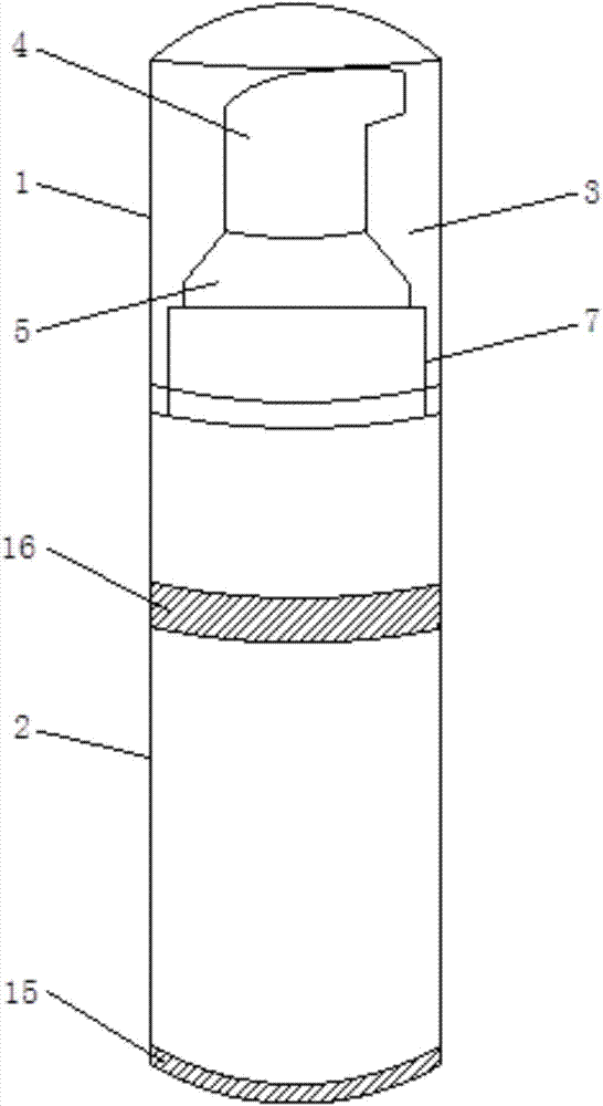 本实用新型公开一种泡沫瓶,包括瓶盖、瓶身和按压器,所述按压器包括按压头、锁环和吸管,所述瓶身顶面上设置有瓶嘴,所述瓶嘴呈环状设置,所述瓶嘴顶面环设有第一凹槽,所述锁环设置在第一凹槽内并与第一凹槽内侧面螺纹连接,所述第一凹槽底面上设置有第一环形密封圈,所述锁环内部底面上设置有第二凹槽,所述第二凹槽内设置有第二环形密封圈,所述瓶身由外向内依次设置有PE材料层、金属铝层和PP材料层;该泡沫瓶密封效果好,抗挤压性强,方便携带。