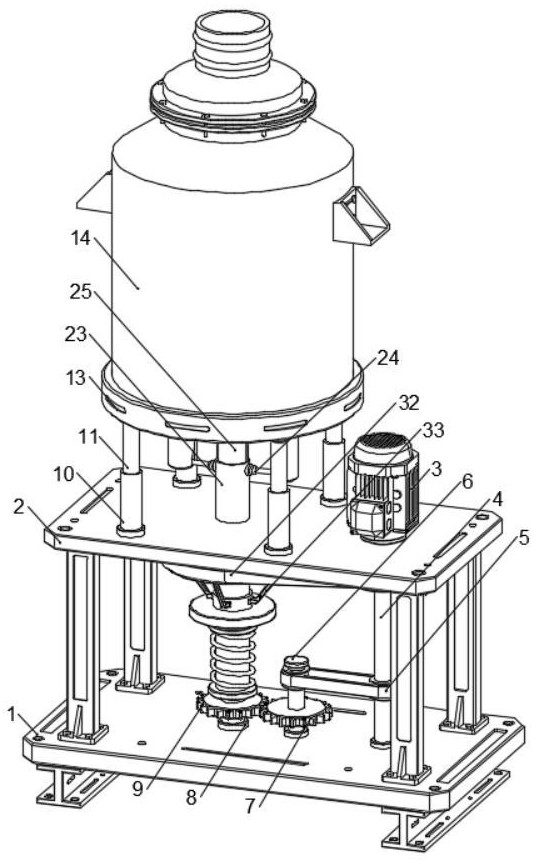 本发明涉及粉底液制备技术领域,具体为基于磁力排斥的变速分散装置及其在粉底液制备中的应用,包括:底座,所述底座上固定有固定板;搅拌桶,设置在所述固定板上,所述固定板上设置有与所述搅拌桶连接的支撑组件;刮板,对称设置在所述搅拌桶内,所述底座上设置有与所述刮板连接的反向转动组件,所述底座上还设置有与所述反向转动组件连接的驱动组件;卡合组件,设置在所述固定板上且与所述搅拌桶连接,所述底座上设置有与所述卡合组件连接的自适应变速机构;磁力缓冲组件,设置在所述底座上且与所述卡合组件和所述自适应变速机构连接;搅拌叶,对称设置在所述搅拌桶内,所述固定板上设置有与所述搅拌叶和所述卡合组件连接的角度调节组件。