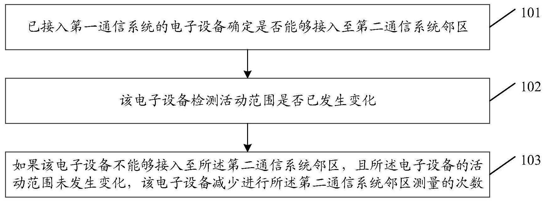 本申请实施例公开了邻区测量方法及装置、设备、存储介质;其中,所述方法包括:确定已接入第一通信系统的电子设备是否能够接入至第二通信系统邻区;检测所述电子设备的活动范围是否已发生变化;如果所述电子设备不能够接入至所述第二通信系统邻区,且所述电子设备的活动范围未发生变化,减少所述电子设备进行所述第二通信系统邻区测量的次数。