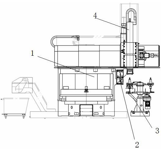本实用新型涉及一种简化数控车床测量多刀位刀具长度系统,在配有刀库的数控车削设备中,在近刀库侧横梁下端面安装触发式刀具长度测量仪,通过刀具切削刃与刀具测量装置接触、配合西门子系统测量装置快速接口控制,通过PLC与自定义NC循环控制,快速完成所有刀具的加工工件的坐标系设定。该系统解决了大型设备多刀位建立加工工件坐标系的设定繁琐难题,该系统通过刀具测量仪,自动测量刀具设备,省略了繁琐的加工前工件加工坐标系的设定工作,节省了用户的加工准备时间,提高了机床的利用率及加工效率。