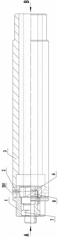 本实用新型公开了一种简易深腔管接头拆装装置,属于机械技术领域。它包括两用扳头和套管,所述套管为通长的圆管件,内部设有一通长的长槽,套管下端两侧均设有一U型槽,套管上端两侧呈削扁的形状;两用扳头为管状件,两用扳头两端的外圆均能与套管的内圆配合连接;两用扳头两端内圆中分别设有与接头体配合的内六方孔Ⅰ和与螺母配合的内六方孔Ⅱ;两用扳头外部的两端分别设有两个销钉,每一侧的两个销钉上下间隔排列,每一侧销钉分别与各自侧的U型槽相对应。本实用新型通过两用扳头和套管的配合卡接,由两用扳头带动管接头转动来进行拆装,解决了深腔管接头由于位置深空间小无法进行连接及拆卸的技术难题,操作简单方便,实用性较强。