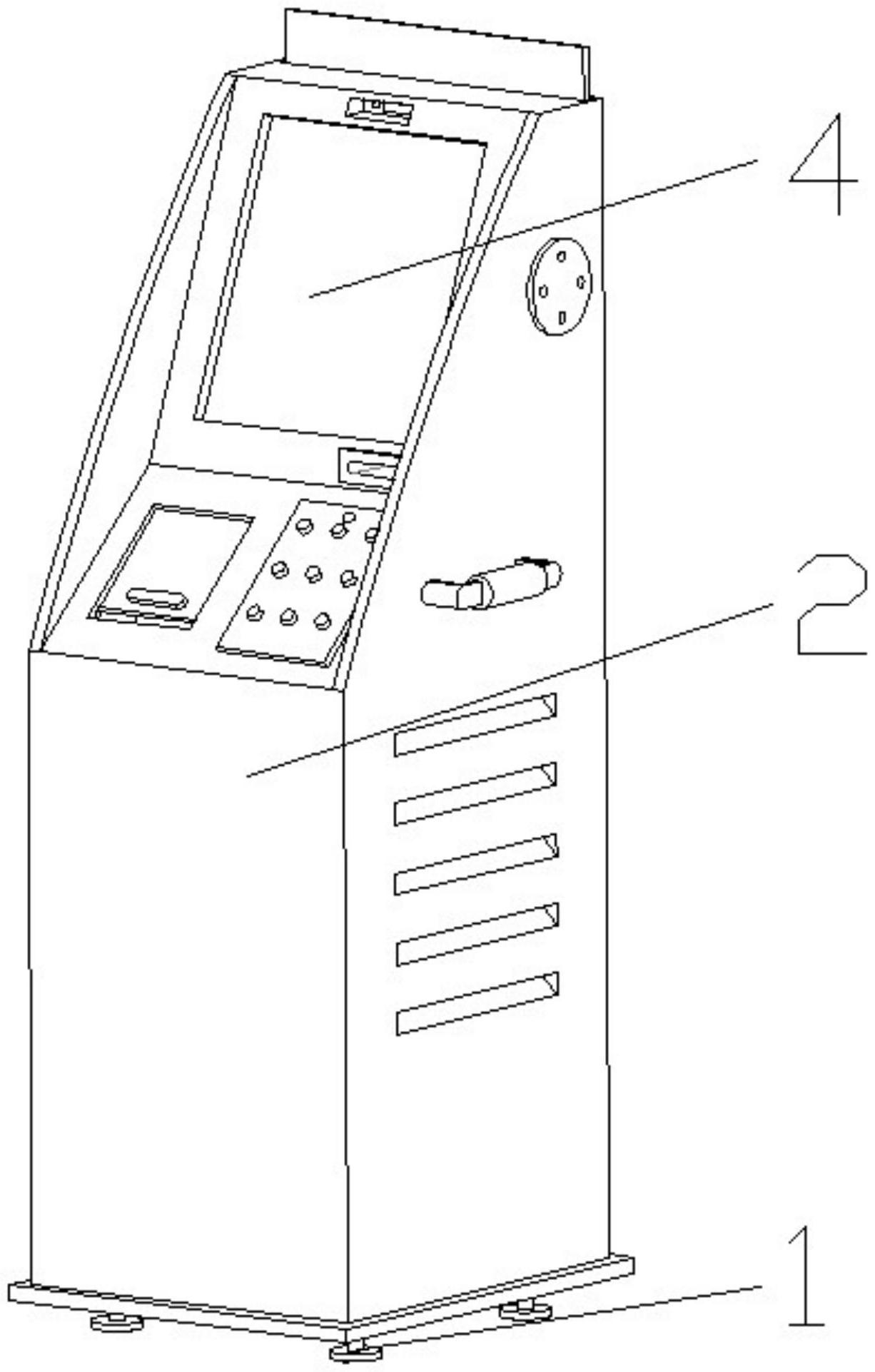 医疗药物终端显示操控屏,包括支撑装置、终端主体、维修装置以及操作装置,支撑装置由支撑板、支撑杆以及防滑板组成,支撑装置的支撑板上设有终端主体,终端主体由装配箱体、散热口、移动把手、蜂鸣器、提示牌以及摄像模块组成,终端主体的装配箱体背部设有维修装置,维修装置由维修门、抓取杆、装配面板以及风机组成,终端主体的装配箱体上设有操作装置,操作装置由显示屏、卡槽、存钱模块以及操作模块组成。由于本实用新型设有维修装置,该装置由维修门、抓取杆、装配面板、风机组成,当用户需要维修时,只需将维修门开启,对设备内部进行维修即可,不需要将设备整体拆卸,提高了用户对设备的维修效率。
