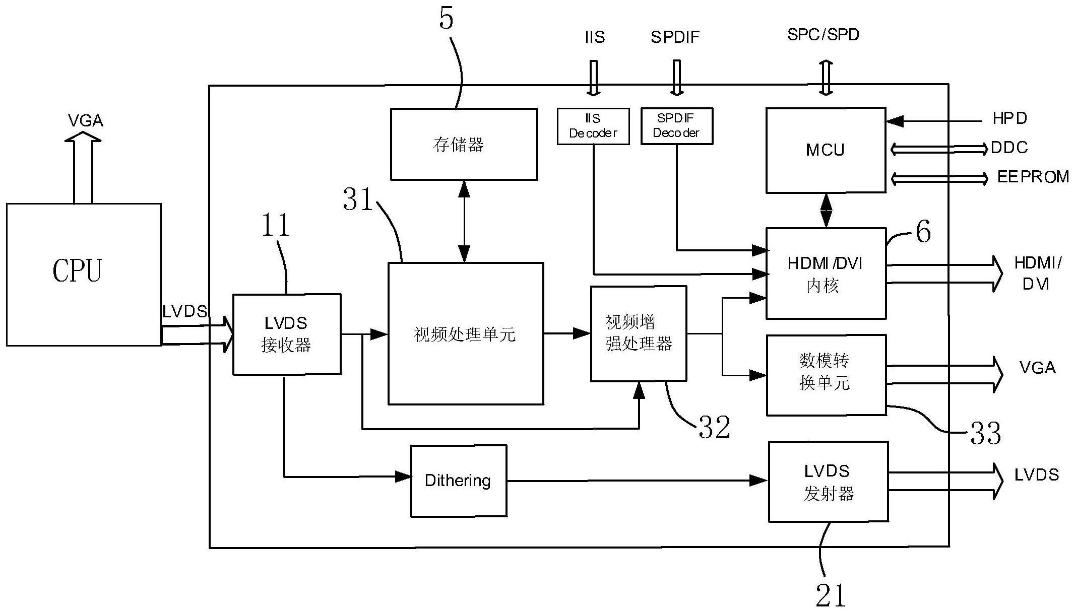 本申请涉及一种数字模拟信号转换集成电路,其包括LVDS信号输入模块,用于接收来自外部的LVDS信号;LVDS信号输出模块,连接于LVDS信号输入模块,用于输出LVDS信号以驱动显示器;数模转换模块,连接于LVDS信号输入模块,用于将LVDS信号转换成VGA信号;VGA输出接口,连接于数模转换模块,用于输出VGA信号;数模转换模块包括数模转换单元以及视频处理单元,视频处理单元用于对输入的LVDS信号进行微调,以对输出的视频进行缩放和调节显示分辨率,视频处理单元连接于LVDS信号输入模块,数模转换单元连接于视频处理单元,VGA输出接口连接于数模转换单元。本申请具有支持两路VGA信号输出,同时支持一路DDI数据信号输入,并输出AV和TV信号,以满足不同接口需求的效果。