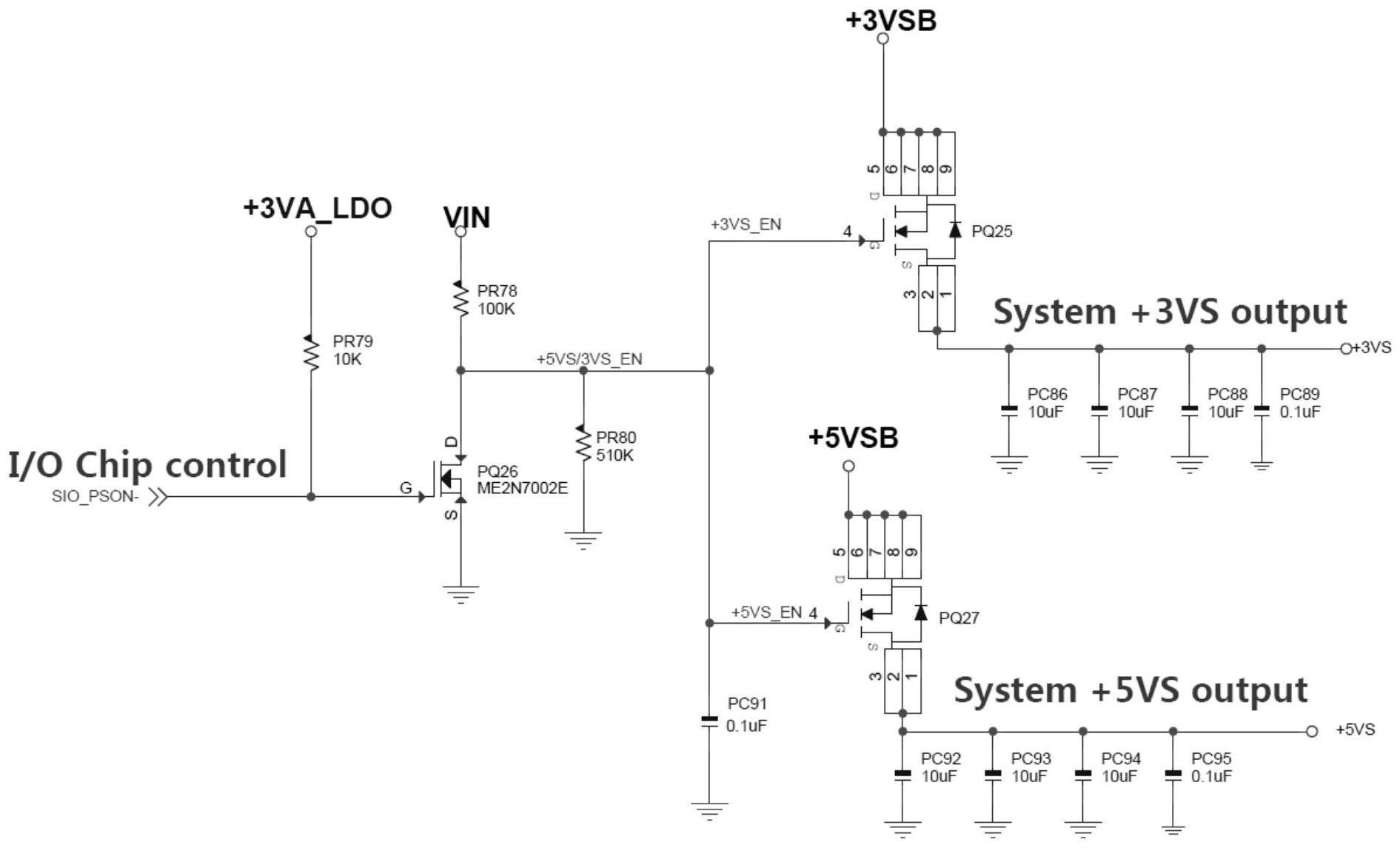 本发明公开了一种3.3V、5V电压输出控制电路,包括待机+3VSB、+5VSB输出控制电路,I/O芯片SIO_PSON‑控制电路,系统+3VS、+5VS输出控制电路,I/O芯片SIO_PSON‑控制电路输出端连接系统+3VS、+5VS输出控制电路;所述待机+3VSB、+5VSB输出控制电路包括控制芯片、+3VA_LDO线性电压输出电路、+5VSB/+3VSB使能控制电路、3.3V待机供电电路、5V待机供电电路。本发明的电路性能稳定,工作效率高。电路芯片支持5V~25V宽压输入供电,通用性强,应用广泛,可作为行业标准电路推广。