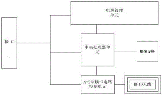 本实用新型公开了一种居民身份证阅读器读卡终端,包括电源管理单元、中央处理器单元、身份证读卡电路控制单元、RFID射频天线、接口和摄像设备。本实用新型与一般居民身份证阅读器相比,没有安全控制模块,它是通过USB接口连接能够上网的智能设备,例如计算机、PAD、和手机等,通过配置上网IP来访问具有身份证安全控制模块的主机,利用网络实现解析身份证信息的目的。本实用新型不仅能读取居民身份证信息,同时极大地降低二代身份证阅读器的研发、生产成本。