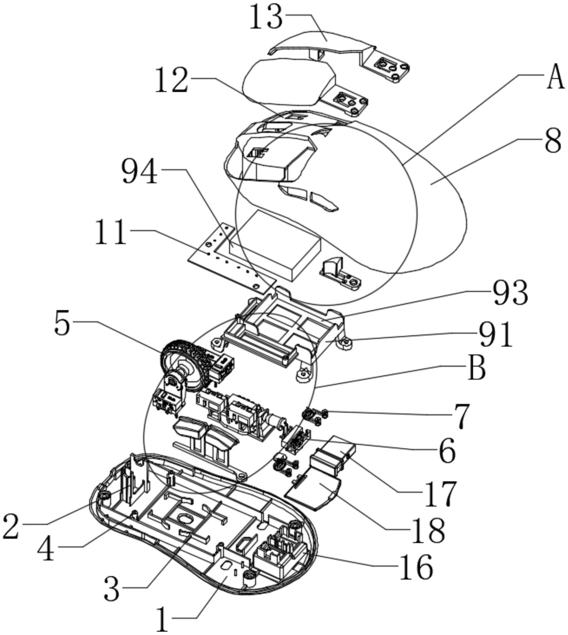 本实用新型公开了一种无线鼠标用电池安装结构,包括底壳、支架、限位骨架和螺纹柱,所述支架固定连接在底壳顶部的左侧,所述限位骨架固定连接在底壳的顶部,所述螺纹柱固定连接在底壳顶部的三角。本实用新型通过设置支架,可以在使用时通过支架将滚轮卡接固定,然后通过限位骨架将拨动开关固定,避免在使用时拨动开关晃动,可以在使用将拨动开关卡住,避免在使用拨动开关晃动,解决了现有电池安装仓结构简单不能对内部电路板与拨动开关进行加强,结构松散,容易在晃动磕损后失去电信号,导致鼠标失灵无法正常操控,降低了操作稳定性的问题。