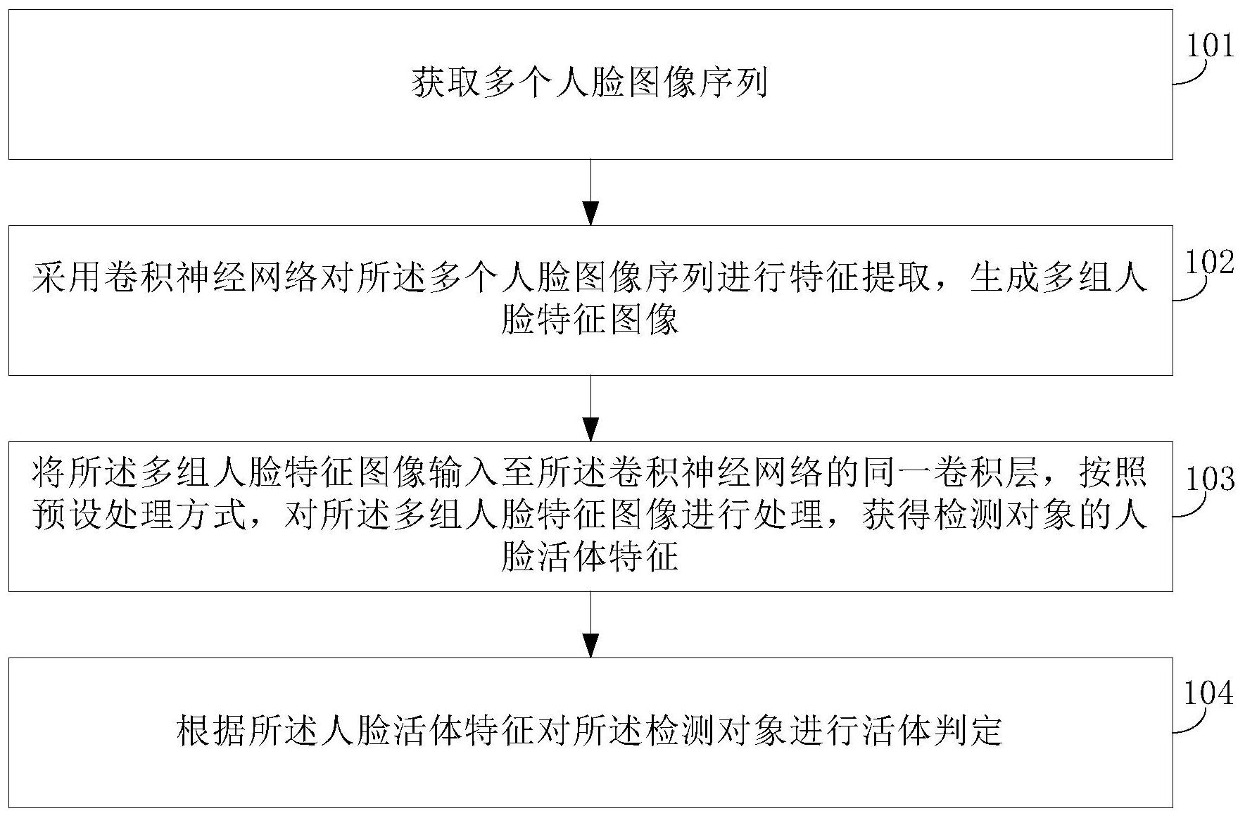 本申请公开了一种人脸活体检测方法及装置,该方法包括:获取多个人脸图像序列,多个人脸图像序列为同一检测对象在多个光谱下的人脸图像序列;采用卷积神经网络对多个人脸图像序列进行特征提取,生成多组人脸特征图像,其中,卷积神经网络包括多个子神经网络,每一个子神经网络用于对多个人脸图像序列中的一个人脸图像序列进行特征提取,生成一组人脸特征图像;将多组人脸特征图像输入至卷积神经网络的同一卷积层,按照预设处理方式,对多组人脸特征图像进行处理,获得检测对象的人脸活体特征;根据人脸活体特征对检测对象进行活体判定。该方法,能够克服可见光下检测不稳定的缺点和采用单帧人脸图像进行活体检测时,检测准确性低的问题。