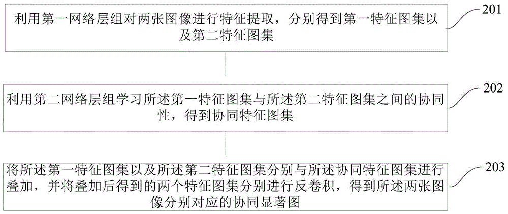 本发明实施例实公开了一种图像协同显著性检测方法及装置,该方法包括:利用第一网络层组对两张图像进行特征提取,分别得到第一特征图集以及第二特征图集;利用第二网络层组学习第一特征图集与第二特征图集之间的协同性,得到协同特征图集;将第一特征图集以及第二特征图集分别与协同特征图集进行叠加,并将叠加后得到的两个特征图集分别进行反卷积,得到所述两张图像分别对应的协同显著图。本发明实施例中的整个检测过程在网络模型中完成,所以无论是提取图像特征还是确定图像之间的协同关系,整个检测过程中各个步骤使用到的网络参数都可以进行不断优化,使用经过不断优化后的网络模型检测图像之间协同显著性,能够保证检测结果的准确性。