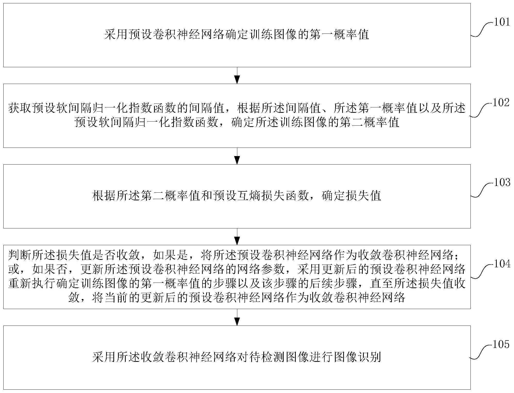 本发明公开了一种基于卷积神经网络的图像识别方法及装置。该方法包括:采用预设卷积神经网络确定训练图像的第一概率值;获取预设软间隔归一化指数函数的间隔值,根据间隔值、第一概率值以及预设软间隔归一化指数函数,确定训练图像的第二概率值;根据第二概率值和预设互熵损失函数,确定损失值;判断损失值是否收敛,如果是,将预设卷积神经网络作为收敛卷积神经网络;或,如果否,更新预设卷积神经网络的网络参数,采用更新后的预设卷积神经网络重新执行前述步骤,直至损失值收敛,将当前的更新后的预设卷积神经网络作为收敛卷积神经网络;采用收敛卷积神经网络对待检测图像进行图像识别。采用该方法对未知图像进行识别,识别结果的准确度更高。