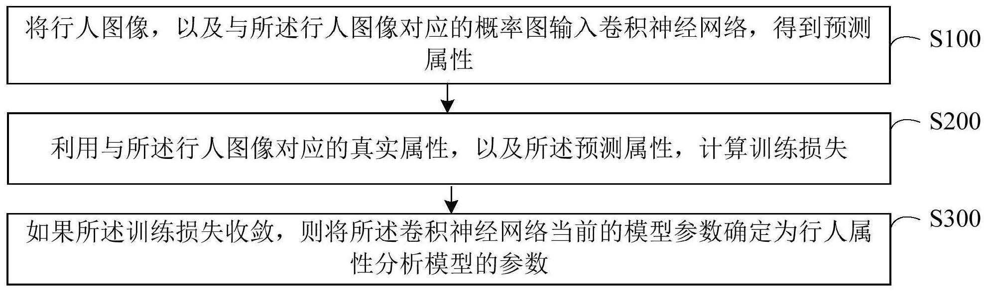 本发明实施例公开一种行人属性分析模型的训练方法及装置,包括:将行人图像,以及与所述行人图像对应的概率图输入卷积神经网络,得到预测属性;所述概率图表征在被划分出至少一个行人部件区域的所述行人图像中,每一个像素节点属于行人部件区域的概率值的集合;利用与所述行人图像对应的真实属性,以及所述预测属性,计算训练损失;如果所述训练损失收敛,则将所述卷积神经网络当前的模型参数确定为行人属性分析模型的模型参数,得到行人属性分析模型。采用上述训练方法训练得到的行人属性分析模型,其在用于识别属性未知的行人图像时,即便面对应用场景、行人姿势、摄像机角度差别较大的行人图像,也可以较为准确地从中识别出行人属性。