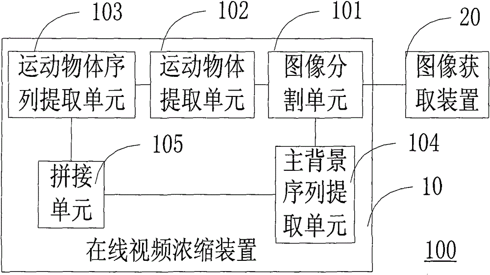 本发明公开了一种在线视频浓缩装置、系统及方法。该方法针对每一帧当前获取的图像依次实时执行,该方法包括:分割步骤,分割图像的背景图像和前景图像;提取步骤,从该前景图像中提取运动物体;运动物体序列提取步骤,累积从多帧该前景图像中分别提取出的运动物体,形成运动物体序列;主背景序列提取步骤,从多帧该图像的背景图像中,提取特定(n)帧背景图像作为主背景序列;拼接步骤,将该主背景序列与该运动物体序列进行拼接。本发明利用在线视频浓缩方式,缩短了浓缩视频长度,尽量保留视频中的运动物体信息。实现快速便捷的视频浏览查阅,具有较好的视觉效果。降低硬件需求和算法复杂度。