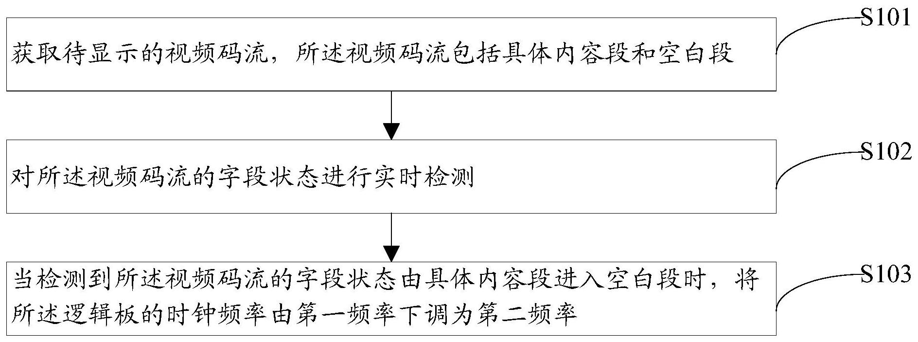 本申请实施例公开了一种显示控制方法、装置、存储介质及电子设备,显示控制方法用于控制显示面板的逻辑板的时钟频率,该方法包括以下步骤:获取待显示的视频码流,视频码流包括具体内容段和空白段;对视频码流的字段状态进行实时检测;当检测到视频码流的字段状态由具体内容段进入空白段时,将逻辑板的时钟频率由第一频率下调为第二频率;从而实现通过调整逻辑板的时钟频率来降低源极驱动器的输出功耗,改善电源环路并降低对应的电磁干扰。