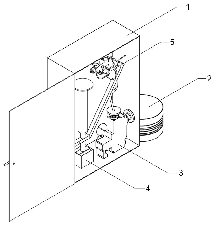 本实用新型涉及鼠标表面修复技术领域,具体为一种鼠标加工表面修复喷涂装置,包括外箱,所述外箱一侧活动安装有油漆桶,所述油漆桶靠近外箱的一侧设有自吸泵组件,且自吸泵组件固定安装于外箱内侧,所述自吸泵组件的左侧固定安装有鼠标旋转组件,所述自吸泵组件的上侧固定安装有喷枪组件。本实用新型通过开启第一电机,油漆桶内的油漆会进入自吸泵组件内,输送至油漆瓶内,从而减少更替油漆瓶的步骤,开启第二电机,转杆转动带动底板固定柱和鼠标底板转动,置于鼠标底板上的鼠标也跟随之转动,此过程可以完成对鼠标表面进行修复。