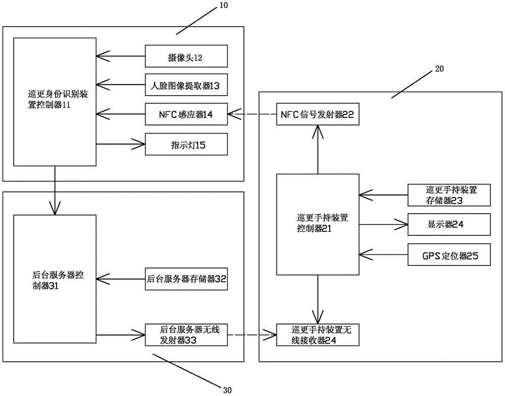 本实用新型公开了一种智能巡更系统,包括有多个巡更身份识别装置、巡更手持装置以及后台服务器,所述巡更身份识别装置包括有巡更身份识别装置控制器以及与其连接的摄像头、人脸图像提取器、NFC感应器,所述巡更手持装置包括有巡更手持装置控制器以及与之连接的NFC信号发射器、巡更手持装置存储器、巡更手持装置无线接收器、显示器,所述后台服务器包括有后台服务器控制器以及与之连接的后台服务器存储器、后台服务器无线发射器,通过人脸信息和NFC信息对巡更人员进行双重识别,大大提高了巡更人员的巡更规范性和环境安全性。