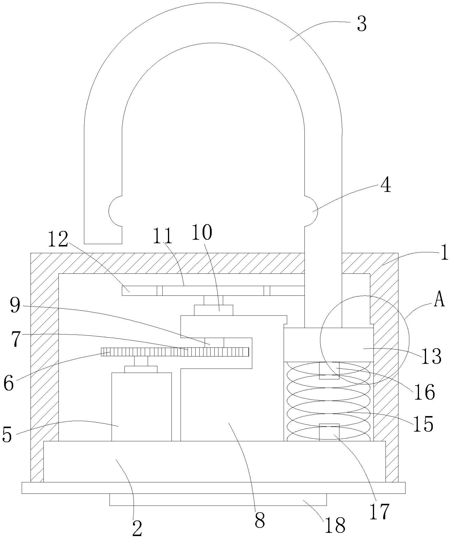 本实用新型涉及电子挂锁技术领域,公开了一种微功耗多功能电子挂锁,包括锁体,所述锁体的下部设置有座体,所述锁体内设置有空腔,所述空腔的一侧设置有驱动机构,所述驱动机构的一端连接有锁梁,所述锁梁的上部延伸至锁体上方,且所述锁梁的两端均与驱动机构活动扣接,在所述空腔的另一侧设置有感应机构,所述感应机构的上部连接锁梁,在所述座体的底端设置有密码区。本实用新型通过设置的感应机构实现对驱动机构进行控制,并且设置的压力感应片能够感应扣板与锁梁槽底壁的加压接触后再发送停止信号至电机,此时电机停止作用,以保证扣板旋转到位与锁梁槽实现适配抵扣,保证锁梁的连接稳固性。