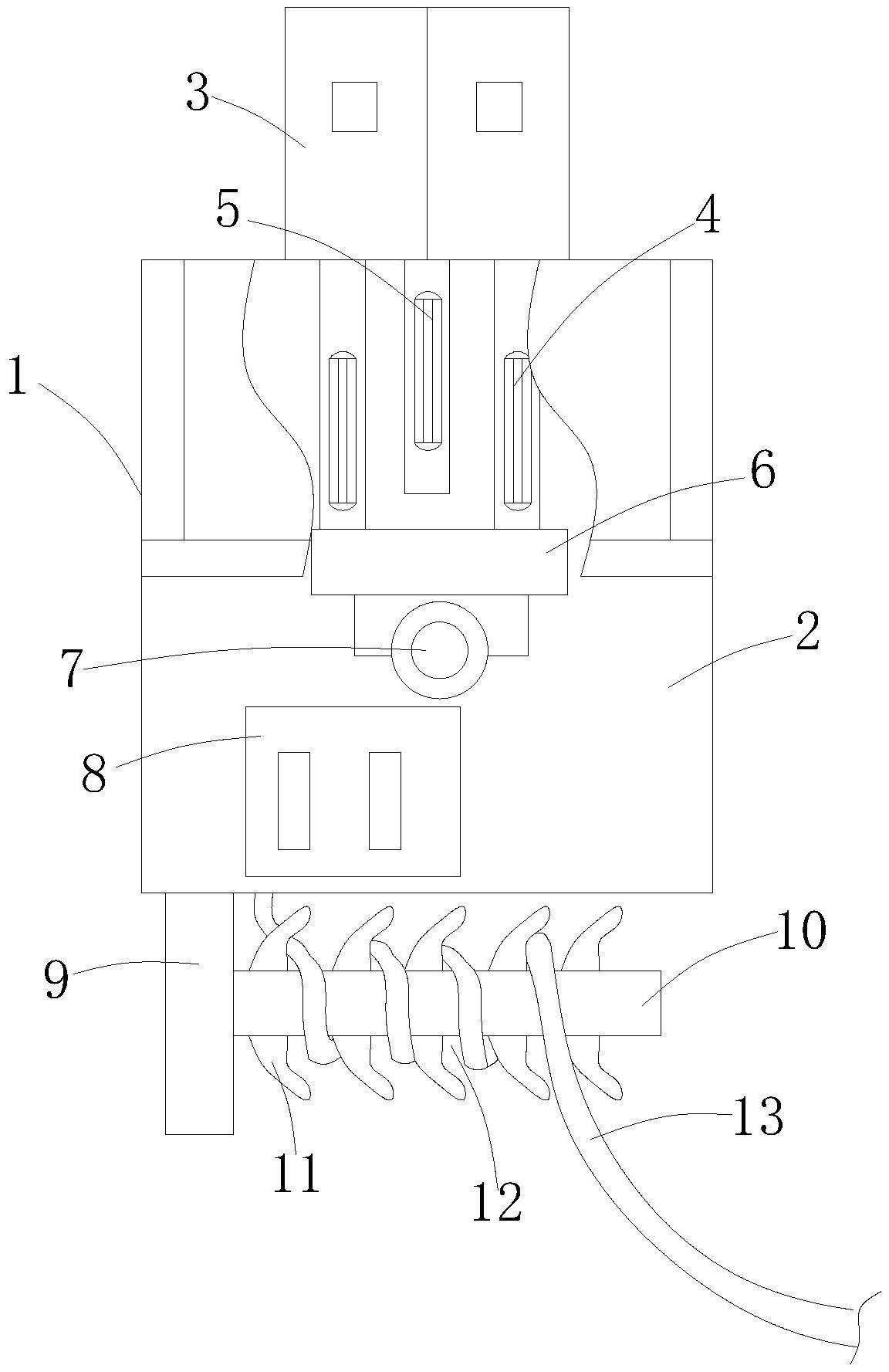 本实用新型涉及门禁设备部件技术领域,公开了一种十通道门禁设备的专用USB充电接头,包括壳体,所述壳体内设置有绝缘基座,所述绝缘基座的一端设置有插接头,所述插接头延伸至壳体的外部,且所述插接头的一端两侧连接有充电电源pin,所述充电电源pin的一端连接有连接座,所述连接座上设置有稳压输出器,所述稳压输出器的一侧设置有变频器,所述变频器的输入端设置有连接线,所述连接线设置在壳体一侧的收线机构上,且末端与外接电源相连接。本实用新型通过在绝缘基座上设置了多个充电电源pin,从而提升了USB充电接头的电源输出量,这样插接头连接在门禁设备上实现充电,提高了充电效率,保证了十通道门禁设备的正常运行。