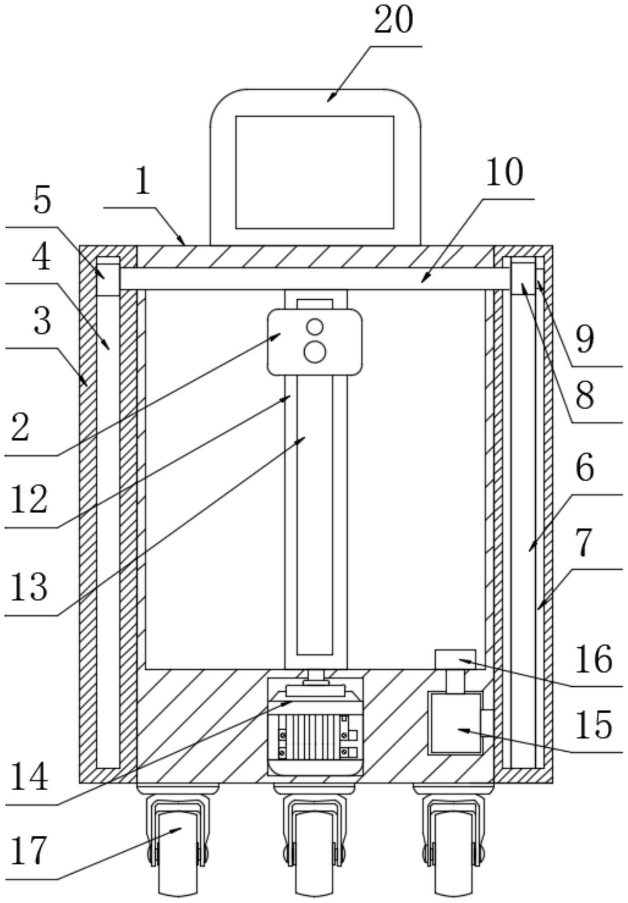 本实用新型公开了一种带人体测温结构的人脸识别机,涉及到人体测温人脸识别领域,包括半圆桶形安装箱和红外线测温人脸识别仪,所述半圆桶形安装箱的两侧均固定安装有安装板,其中一个所述安装板表面固定安装有第一电动滑轨,所述第一电动滑轨的内部滑动连接有第一电动滑块,另一个所述安装板的表面开设有滑槽,所述滑槽的两侧均开设限位滑槽,所述滑槽的内部滑动连接有滑块,所述滑块的两侧均固定安装有限位滑块。本实用新型能够防止透明钢化玻璃在雨水天气或天气寒冷的情况下表面和内部产生水珠和雨水,影响红外线测温人脸识别仪的正常使用,还能够对不同高度的人员进行测温和人脸识别。