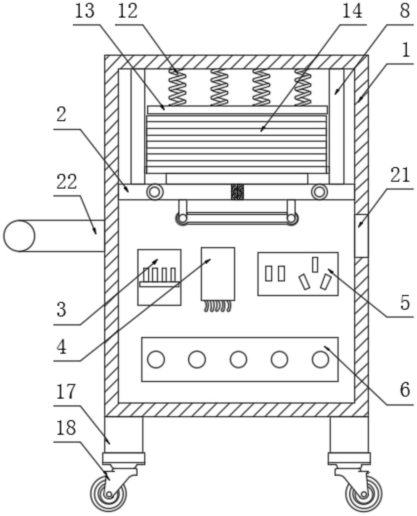 本实用新型公开了用于通用紧急报警系统的报警电源箱结构,涉及到电源箱安全防护领域,包括电源箱,所述电源箱的内侧固定安装有隔板,所述电源箱的内部后侧固定安装有断路器、保护装置、插座,接线座,所述电源箱的前侧通过转轴转动连接有箱门,所述隔板的顶部两侧均固定安装有限位板,所述隔板的内部开设有矩形口,所述矩形口的内部两侧均通过铰链转动连接有翻板,两个所述翻板的底部均固定安装有U形连接件,两个所述U形连接件之间通过连接绳连接。本实用新型能够在装置内部燃起明火时快速对装置内部的明火进行扑灭,防止发生严重火灾,造成财产和人员伤亡,还能够便于对装置进行移动。