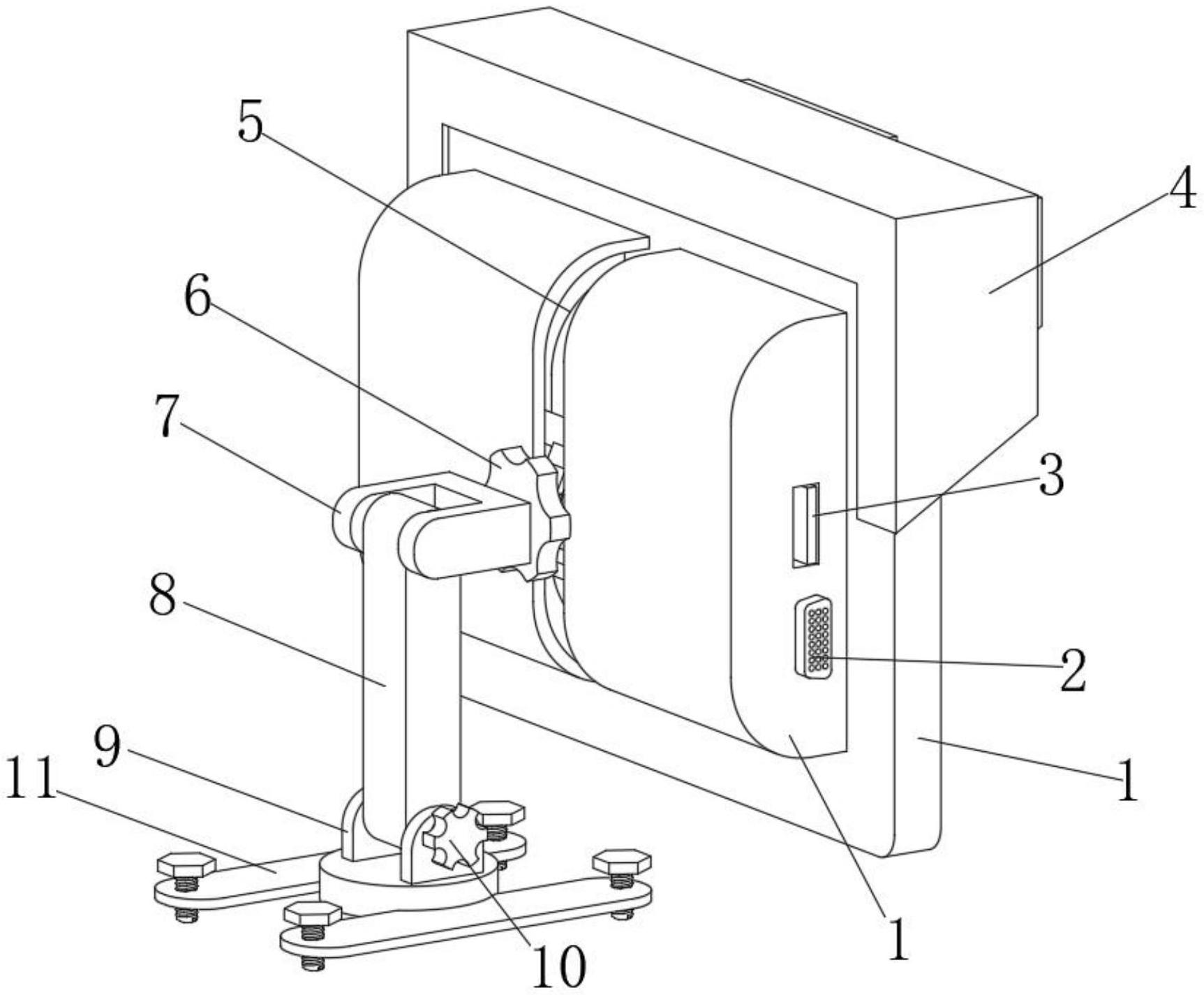 本实用新型公开了一种网络录播高清监视器,包括显示屏,所述显示屏前端固定连接有后盖,所述后盖右端上部固定连接有电源接口,所述后盖右端下部固定连接有视频接口,所述后盖前端开有滑槽,所述滑槽内卡接有角度调节装置,所述角度调节装置前端固定连接有连接块,所述连接块通过转轴活动连接有支撑柱,所述支撑柱右端下部穿插活动连接有调节螺栓,所述调节螺栓外表面左部和外表面右部均螺纹连接有连接板,两个所述连接板下端共同固定连接有固定安装座,所述显示屏上端卡接有遮光装置。本实用新型所述的一种网络录播高清监视器,安装效率高,固定效果好,稳定性高,适合网络录播的使用。