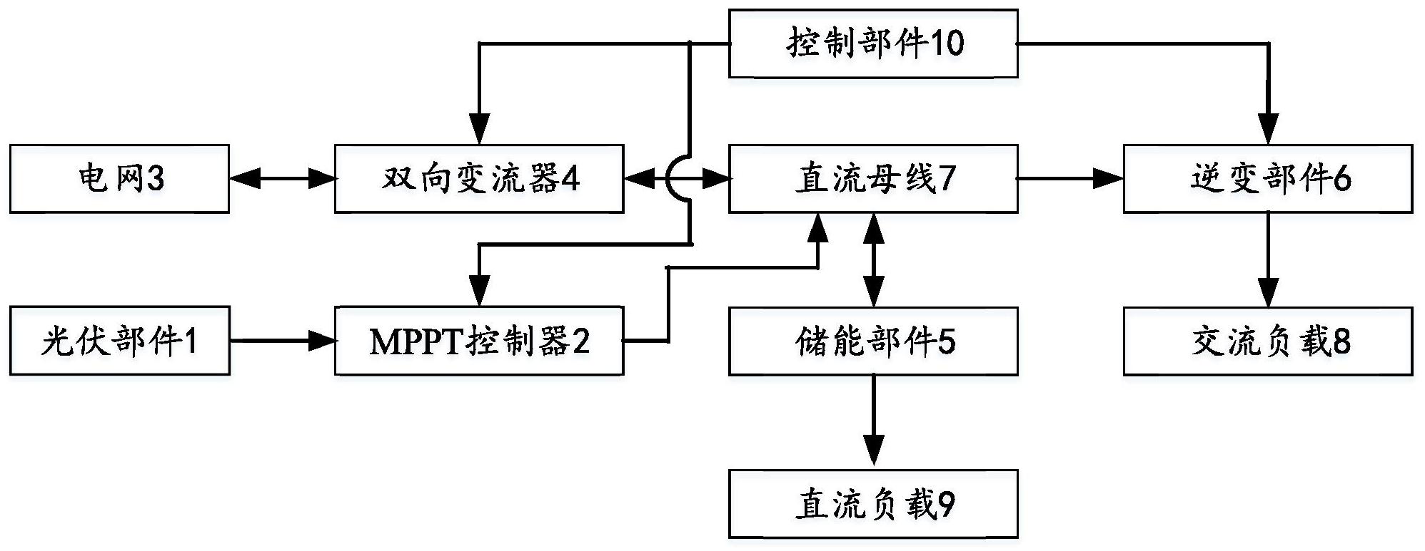 本发明公开了一种光伏离并网储能逆变器,包括:光伏部件、与所述光伏部件相连接的MPPT控制器、一端连接电网的双向变流器、储能部件和逆变部件;所述双向变流器另一端、MPPT控制器输出端、储能部件、以及逆变部件输入端相互连接;所述储能逆变器还包括与所述MPPT控制器、双向变流器和逆变部件相连接的控制部件,该控制部件用于判断所述光伏部件是否工作在最大功率点上,若所述光伏部件未工作在最大功率点上,则所述控制部件通过控制MPPT控制器以使得所述储能逆变器工作在最大功率点上;本发明能够在外界条件变化下始终保持最大功率跟踪,光伏发电转换效率高,可以控制电能的合理流动,提高了光伏能量利用率。