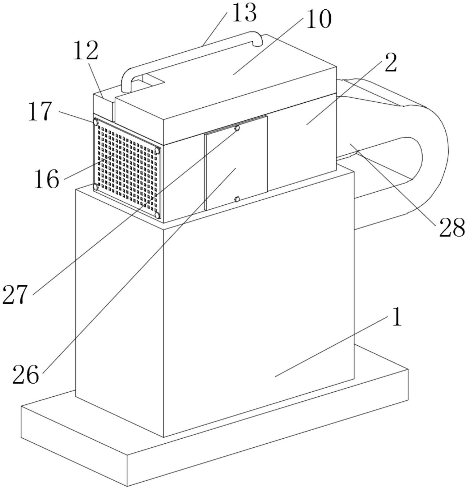本实用新型涉及变压器的顶部风箱散热技术领域,具体为一种变压器的顶部风箱散热结构,包括变压器主体,所述变压器主体的顶端设置有散热箱,所述散热箱的一端开设有进风口。当用户使用本装置时,集流件内部的清水通过水泵可进入水箱的内部,水箱内部的清水通过分流件进入降温管的内部,降温管可将自身周围的空气进行降温,当扇叶的一端产生吸力,将降温管降温后的空气吸走,通过干燥机构进行干燥,然后在通过风管吹向变压器主体的内部,从而对变压器主体的内部进行降温,本装置通过对空气进行降温,降温后的空气再对变压器主体进行降温,从而提高了对变压器主体的降温效果,防止变压器主体内部因过热而老化,进而的提高了变压器主体的使用寿命。