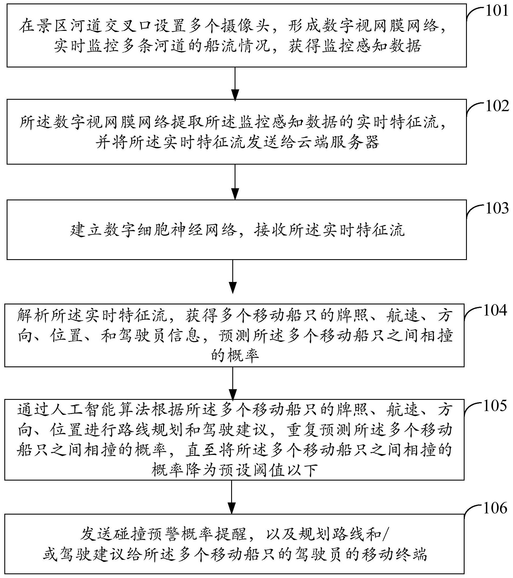 本申请实施例提供一种景区河道视觉识别移动船只跟踪联动方法和系统。该方法包括:在景区河道交叉口设置多个摄像头,形成数字视网膜网络,实时监控多条河道的船流情况,获得监控感知数据;所述数字视网膜网络提取所述监控感知数据的实时特征流,并将所述实时特征流发送给云端服务器;建立数字细胞神经网络,接收所述实时特征流;解析所述实时特征流,获得多个移动船只的牌照、航速、方向、位置、和驾驶员信息,预测所述多个移动船只之间相撞的概率;通过人工智能算法根据所述多个移动船只的牌照、航速、方向、位置进行路线规划和驾驶建议,重复预测所述多个移动船只之间相撞的概率,直至将所述多个移动船只之间相撞的概率降为预设阈值以下。