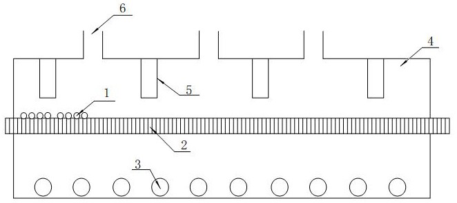 一种回收料烘干除铁装置,包括内部中空的烘干仓、用于输送回收改性料的输送带;所述输送带横穿在烘干仓的中部,所述烘干仓内部的烘干腔底部均布有若干加热管,所述烘干仓烘干腔的顶部均布有若干磁铁棒,所述磁铁棒竖直设置,所述磁铁棒底部与所述输送带上端面之间的间距不超过10cm;所述烘干仓顶部有若干开口,各所述开口处连通有通风管,所述通风管与抽风机接通。可一次性对回收料颗粒进行烘干除铁,降低处理时间,有效提高生产的效率。