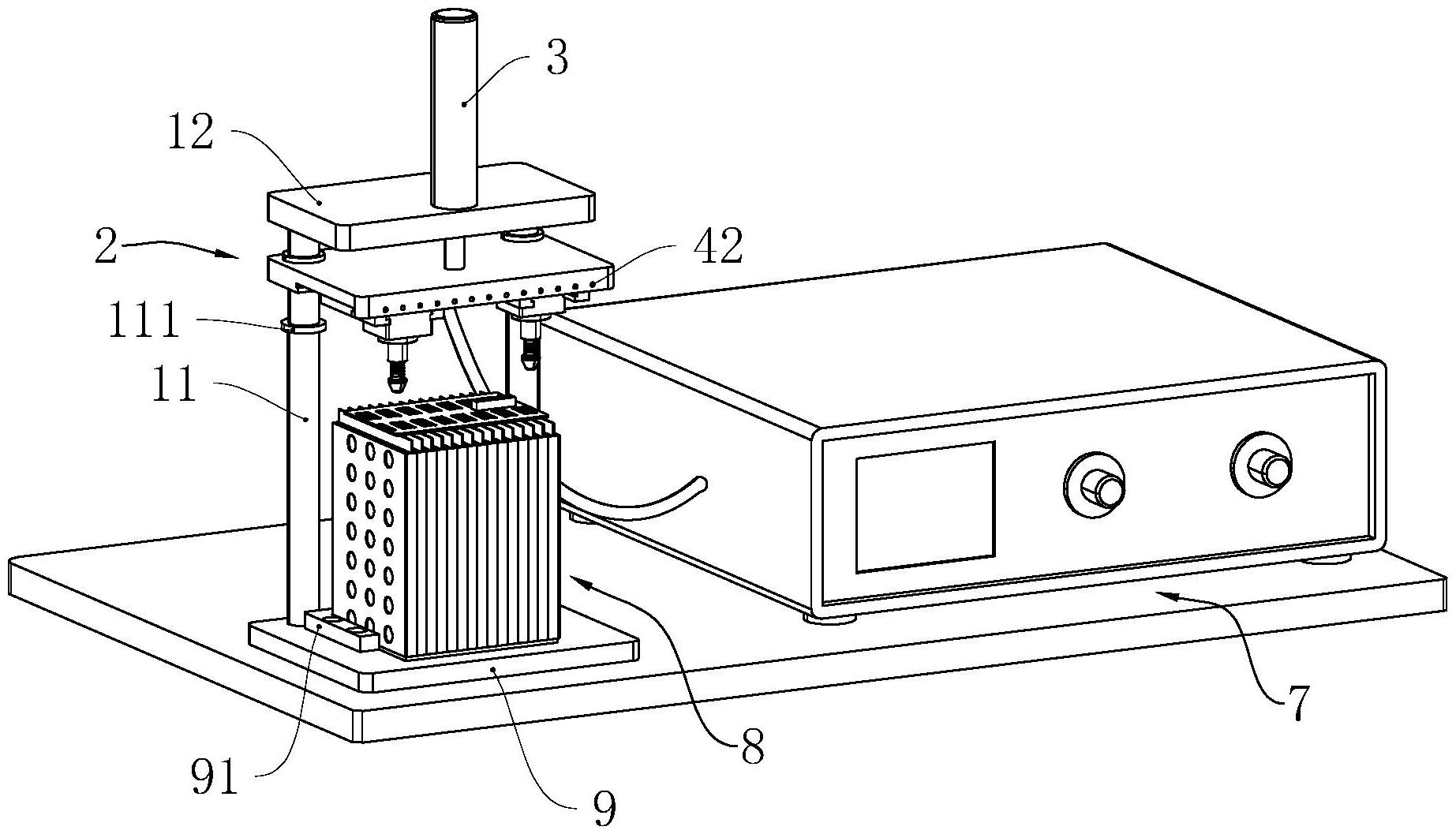 本实用新型为一种锂电池快速检测装置,属于锂电池测试装置领域,针对现有测试装置测试效率低、不适于批量测试的问题,采用技术方案如下:支撑架;检测机构,包括设置在支撑架上的升降驱动装置和被升降驱动装置驱动升降的升降台,升降台设有沿第一水平方向布置的滑槽,滑槽内设置两个滑块组件,每个滑块组件的下端连有测试组件,滑块组件能带动测试组件沿第二水平方向移动;待测工位,位于检测机构正下方;控制机构,用于控制升降驱动装置启闭以及接收测试组件的测试数据。两个滑块组件带动两个测试组件在水平面内沿第一水平方向和第二水平方向移动,能够较好地适应各种尺寸待测锂电池,适用范围广,测试方便、快捷、效率高,适于批量测试。
