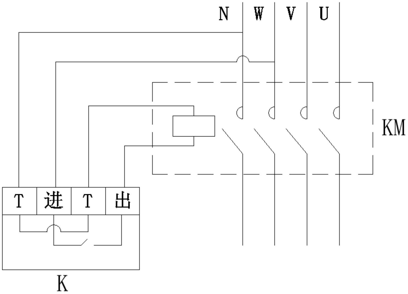 本实用新型提供了一种充电桩供电节能自动控制装置。本充电桩供电节能自动控制装置包括接触器KM和控制开关K,接触器KM包括线圈和触点开关,控制开关K和线圈串联在电网的零线和其中一条火线之间形成控制回路,触点开关一侧用于连接电网,触点开关的另一侧用于连接充电桩。本充电桩供电节能自动控制装置能够根据时间段对充电桩的供电进行通断控制,减少充电桩待机功耗,从而更加节能环保。