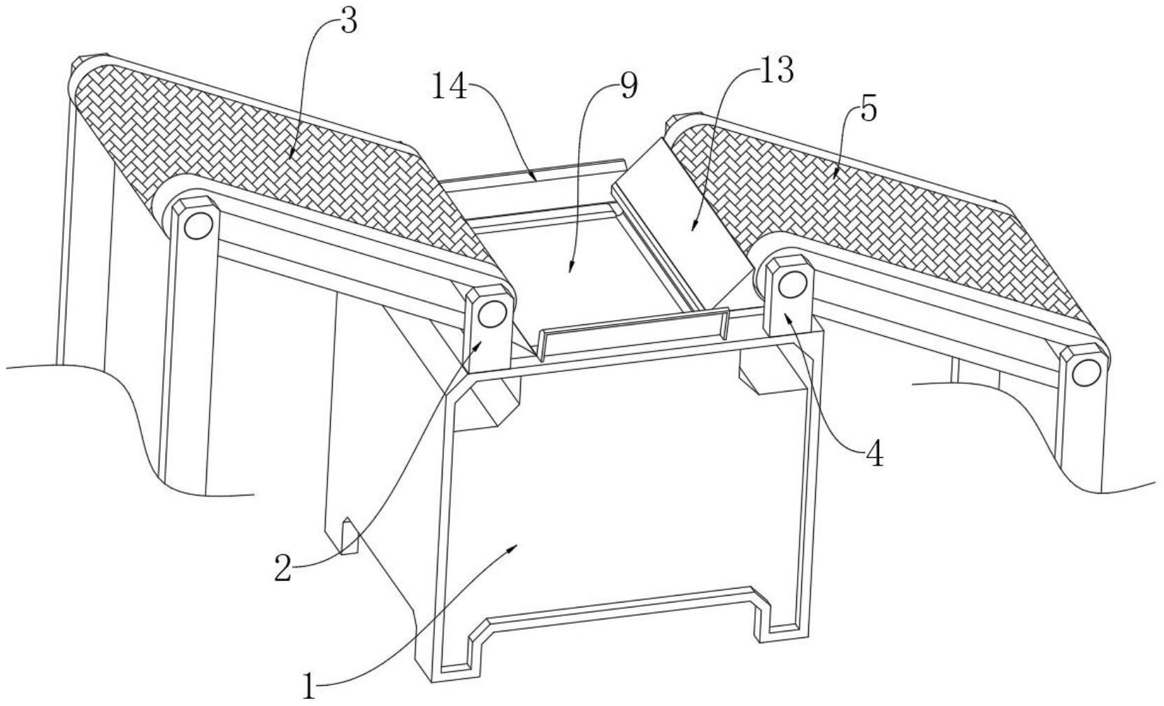 本实用新型属于蓄电池外壳加工技术领域,尤其是一种蓄电池外壳加工出料装置,针对了对蓄电池外壳出料时易与废料出现混淆,不易对蓄电池外壳高效出料的问题,现提出如下方案,其包括工作台,工作台还包括一支架a,支架a固定于工作台顶端侧壁,支架a一侧侧壁转动连接有相适配的传送带a,传送带a位于工作台顶端侧壁,工作台顶端侧壁固定有支架b;本实用新型中在承载板处于倾斜状态时,能够使得残屑以及废料滑落至凹槽内,同步实现对蓄电池外壳的取出及废料的收集,既可以实现高效的处理废料作用,又可以精准的实现蓄电池外壳出料,极大的节省了出料周期,而且可以降低流水成本,便于大范围推广,更加便于后期的成品加工。