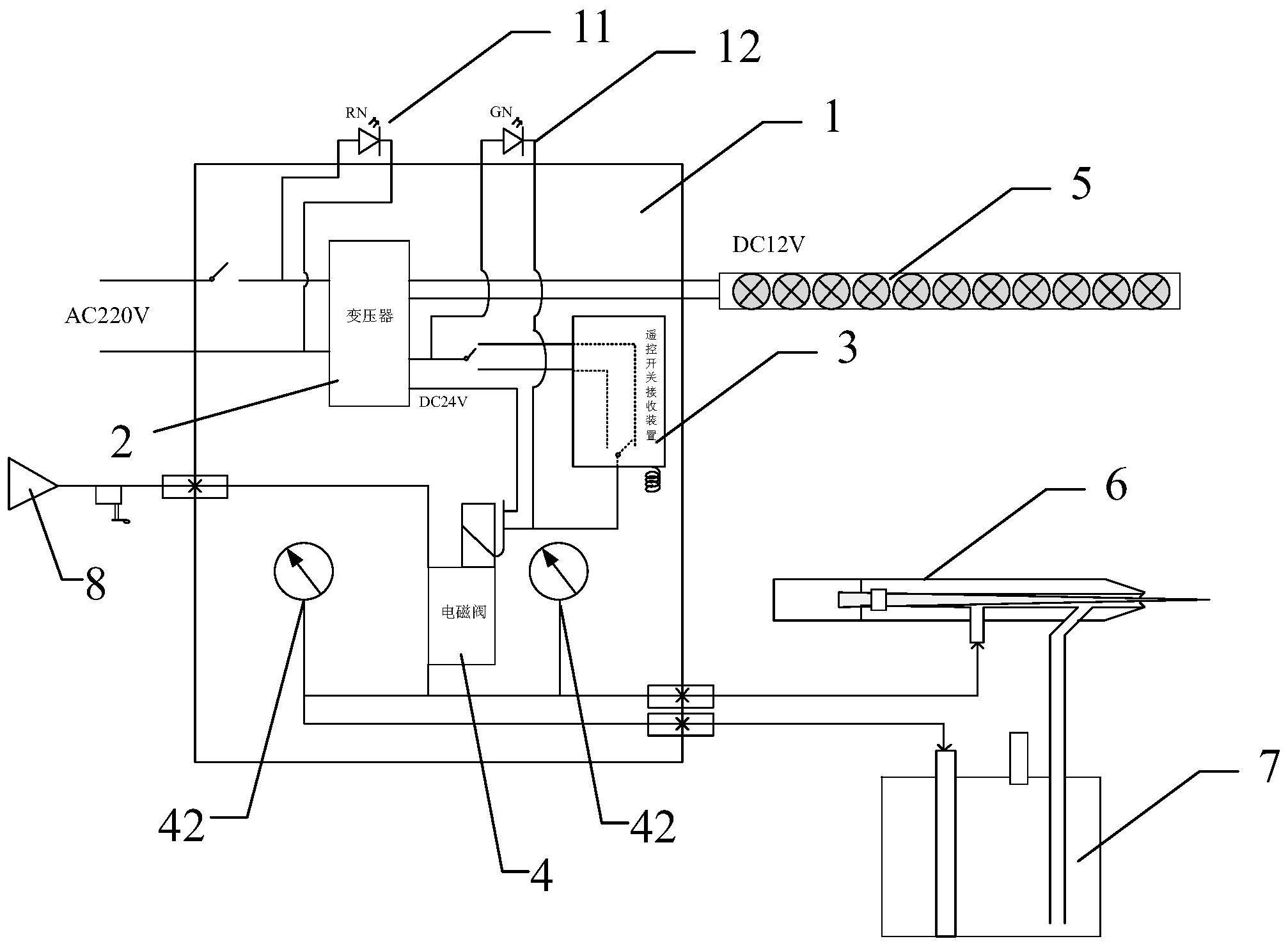 一种印刷品在线自动隐形标识系统,设备包括机箱、紫外线检测装置和工作装置,工作装置包括标记机构和墨盒,机箱内设有变压器、遥控开关接收装置和电磁阀,变压器将AC220V转换成DC12V和DC24V二种电压,变压器DC24V输出端与遥控开关接收装置输入端连接,变压器DC12V输出端与安装在机箱外的紫外线检测装置连接,遥控开关接收装置输出端与电磁阀连接,电磁阀通过导线和开关与变压器DC24V输出端连接,电磁阀上连接有外接气源,电磁阀输出气口通过三通阀分别与标记机构和墨盒连接。本发明克服了现有技术的不足,实现自动化在线印刷标识防伪标记,做到产品实物流清晰管控,产品品质清晰管控,满足书刊产品低成本高性能的防伪要求。