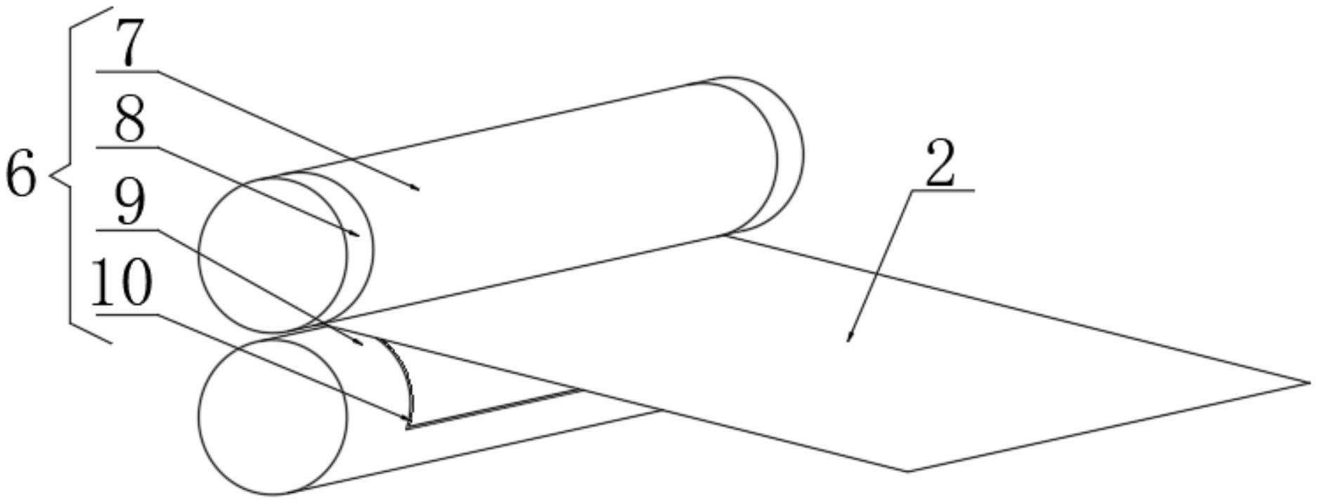 本实用新型涉及印刷设备技术领域,公开了一种基于印刷机的在线模切装置,包括印刷机主体和放置板,所述印刷机主体的内部设置有放置板,所述印刷机主体的内部安装有第一转轴,所述印刷机主体的内部还安装有第二转轴,所述第一转轴和所述第二转轴的连接处放置有印刷纸,所述第一转轴的左表面安装有模切组件,通过设置模切组件,可实现印刷和模切一体化生产,并且通过设置抵靠垫,当压抑筒的外表面粘贴不同规格的模切条之后,通过抵靠垫的柔软性,可以使印刷纸紧紧贴合在模切条的上表面,加强了适应性,并且通过设置模切组件,大大提升了生产效率,降低了生产成本和人工成本,增强了实用性。