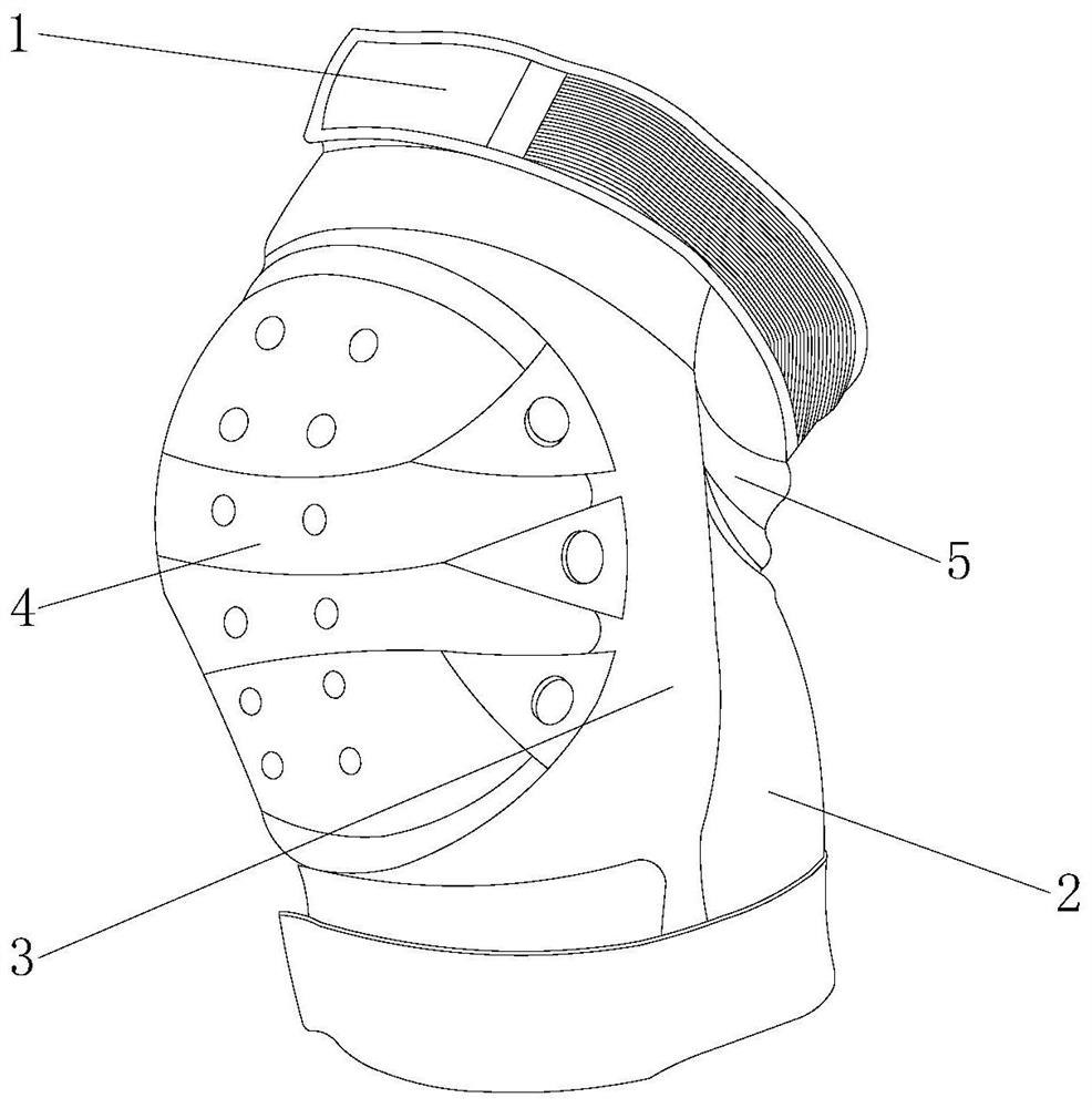 本发明公开了一种滑雪智能穿戴设备,其结构包括魔术贴、后背弹力带、包裹软带、护板壳、数据传输器,魔术贴共设有两个,当运动员滑雪过程中膝盖进行弯曲时,通过后背弹力带进行拉扯,使得弯曲牵引进行牵引工作,这时展开板进行展开的同时带动三个弯曲开闭同时进行展开工作,开闭板前端的弧形褶皱进行打开,扩大了硬壳体的保护面积,同时硬壳体上的固定点与后背弹力带的位置随着拉动而改变,从而减弱了硬壳体与后背弹力带之间的拉扯力,防止硬壳体与背弹力带过度拉扯导致脱落,弯曲的同时绑带拉动拉轴进行移动,侧翼片展开,扩大了两侧的包裹面,拉扯带对贴合片拉扯,使得贴合片对膝盖的表面进行紧密贴合,提高了对膝盖的包裹贴合性。