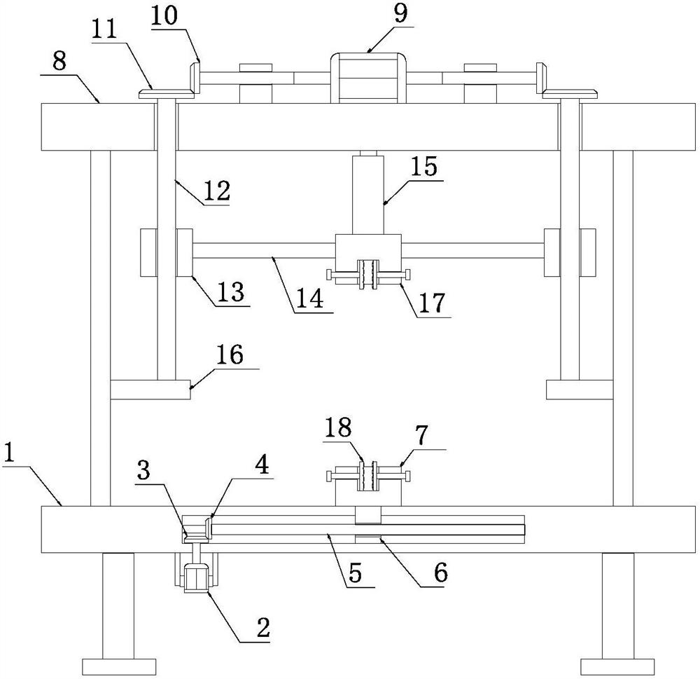 一种乳胶手套胶膜强度检测装置,包括:固定台,固定台下端一侧固定连接伺服电机,伺服电机输出端固定连接第一伞齿轮,第一伞齿轮一侧啮合连接第二伞齿轮,第二伞齿轮一侧固定连接第一螺纹杆,第一螺纹杆和固定台内壁转动连接,第一螺纹杆上螺纹连接移动环,移动环上端固定连接第一夹持台,固定台上端固定连接支撑架,支撑架上端固定连接双头电机,双头电机两侧输出端均通过转杆固定连接第三伞齿轮,本实用新型的有益效果是:通过设置的伺服电机带动的第一夹持台和双头电机带动的第二夹持台结构,能够对胶膜进行垂直与水平的强度检测,从而能够更好的检测胶膜的强度,使胶膜的检测更加全面,避免出现遗漏。