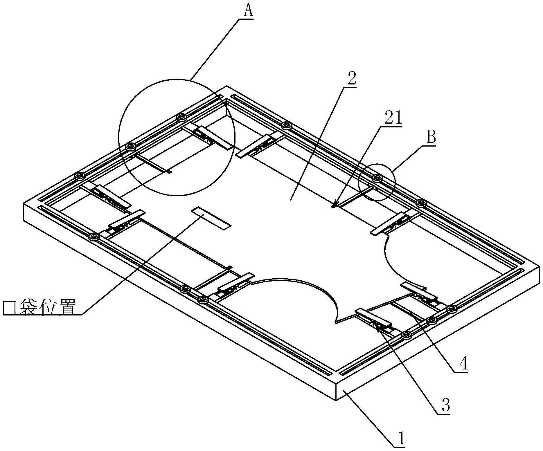 本实用新型涉及一种模板口袋的定位工具,属于模板缝纫机定位工装技术领域,包括定位框和开袋片,定位框呈矩形环状,其特征在于,定位框四周边框可拆卸连接有用于固定开袋片的定位夹,定位框两平行的边框之间可拆卸连接有第一定位组件,定位框另外两平行的边框之间可拆卸连接有第二定位组件,第一定位组件垂直于第二定位组件,开袋片两侧边分别开设有剪口。开袋片剪口分别与第一定位组件和第二定位组件对齐,定位夹对开袋片进行固定,模板缝纫机以第一定位组件和第二定位组件的交点为零点来确定口袋的加工位置,不同尺寸的开袋片加工时,只需剪口分别于第一定位组件和第二定位组件对齐即可,提高生产效率,节约生产成本。