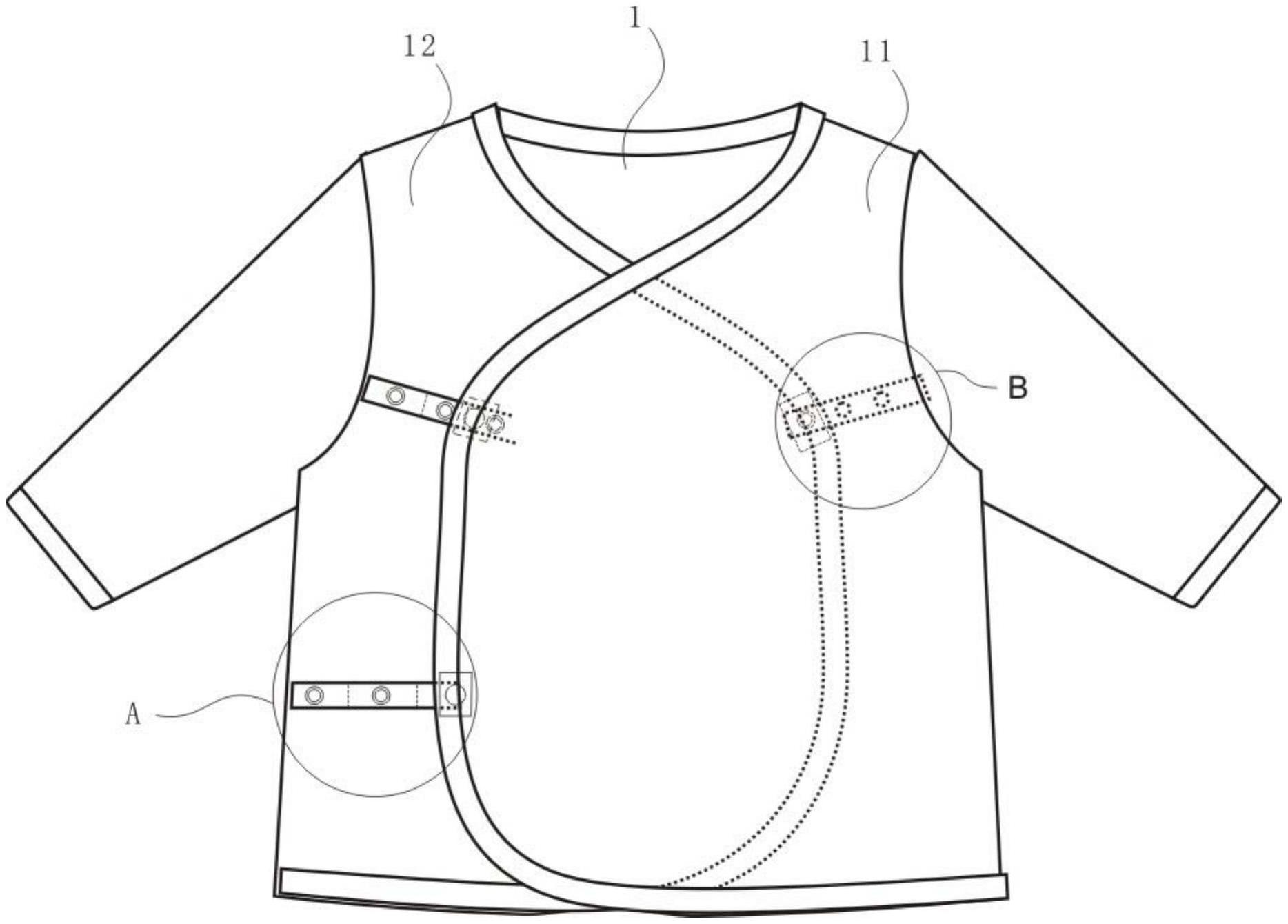 本实用新型实施例公开了一种便于固定的婴幼儿服装,包括背部以及设置于所述背部两侧边的前部前片与前部后片,所述前部后片临近侧边之间设置有第一扣体,所述前部前片的前沿对应所述第一扣体的位置设置有第二扣体,所述前部前片与前部后片通过所述第一扣体、第二扣体扣合连接。采用本实用新型,通过按扣的方式固定前部前片与前部后片,避免了使用绑带的方式造成的安全隐患,且穿着更为方便,通过设置可插入的套指位,更是方便了用户进行按扣连接。