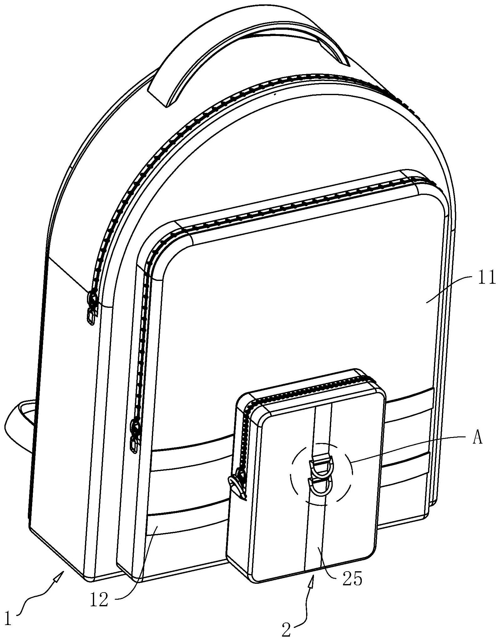 本申请涉及背包的技术领域,尤其是涉及背包及应用于该背包的附属包,包括有背包,背包前侧设置有安装带,安装带包括有插入部,插入部两宽边与背包进行连接,背包与插入部之间形成有上下贯穿的容腔,背包前侧设置有附属包,附属包背侧设置有连接组件,连接组件穿设于插入部与背包之间的容腔内,附属包与背包之间通过连接组件进行连接,插入部两宽边对连接组件进行限位,可以减少附属包与背包连接时、附属包的摇晃情况。