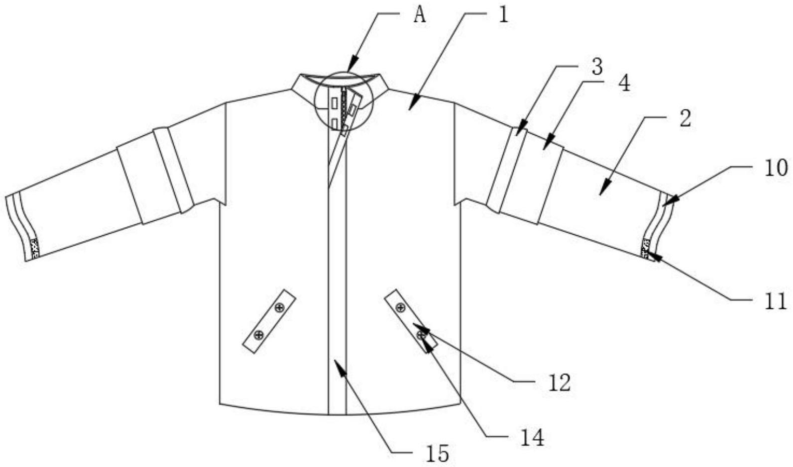 本实用新型公开了一种聚酯纤维防泼水夹克,包括衣身,所述衣身的两侧对称设置有用于穿过胳膊的衣袖,所述衣袖的中部设置有用于反光的提示结构,所述提示结构包括套设在衣袖中部的连接罩,所述衣袖的中部套设有母魔术贴环。本实用新型一种聚酯纤维防泼水夹克,在原有的基础上增加了连接罩、反光袖套、公魔术贴块和母魔术贴环,当需要在夜间穿戴夹克在外跑步时,将反光袖套穿过衣袖,将反光袖套一侧的公魔术贴穿过连接罩,使其粘接在母魔术贴环上,从而通过公魔术贴块固定在衣袖上,从而实现在夜间跑步时车灯照在反光袖套上时,反光袖套进行反光,从而使驾驶员观察到跑步的人员,从而保证了在夜间跑步人员的安全。