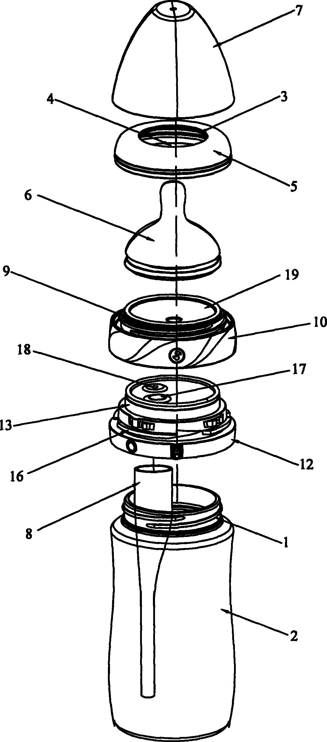 本实用新型公开了一种新型奶瓶,包括瓶体、奶嘴座、奶嘴和罩盖,其中,还包括瓶口盖和瓶体内吸管,瓶口盖包括上与奶嘴座螺接的上盖和下与瓶体螺接的下盖,上、下盖均中部上凸成底有内凹腔、顶有上凸台,上盖上凸台台面抵顶奶嘴底檐,下盖上凸台伸入上盖内凹腔且下盖上凸台台面抵顶上盖内凹腔腔顶面,上盖内凹腔围壁内设卡接部,下盖上凸台围壁外设卡挂部,上盖可旋拧自转并通过卡接部轴向防脱的卡挂在下盖卡挂部上,下盖上凸台台面开第一、二出水孔,上盖上凸台台面开随上盖旋拧自转可在第一、二出水孔间选择性切换对应的通水孔,吸管上连下盖内凹腔腔顶面对应第一出水孔的位置处。本实用新型既能直立直吸又能倾斜允吸、节约资源、减少育儿成本。