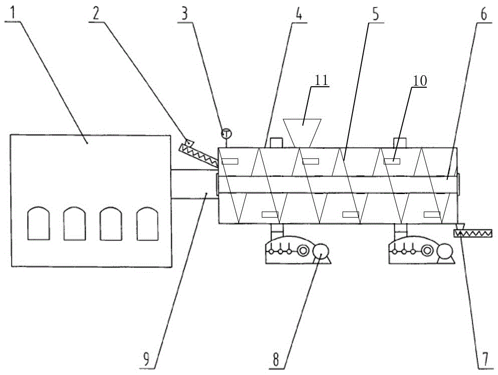 本实用新型公开了一种用于谷氨酸菌体蛋白的新型烘干装置,它包括热风炉、滚筒和动力装置,其特征是热风炉和滚筒由热风管道连通,滚筒的两端分别设有进料绞龙和出料绞龙,滚筒内设有主轴,主轴上均匀设有螺旋搅拌叶片,所说动力装置通过齿轮与滚筒外面设有的齿轮相啮合;滚筒的顶部设有与其连通的二次加料斗;螺旋搅拌叶片上设有若干拨动板。本实用新型设计合理,结构紧凑,维修方便,解决了现有技术操作不方便、系统连贯性不好、产品质量差和拌效果差不能二次加料的技术问题,由于该烘干设备结构紧凑、操作方便、生产连续好、投资少,因此,在蛋白生产行业中具有推广应用价值。