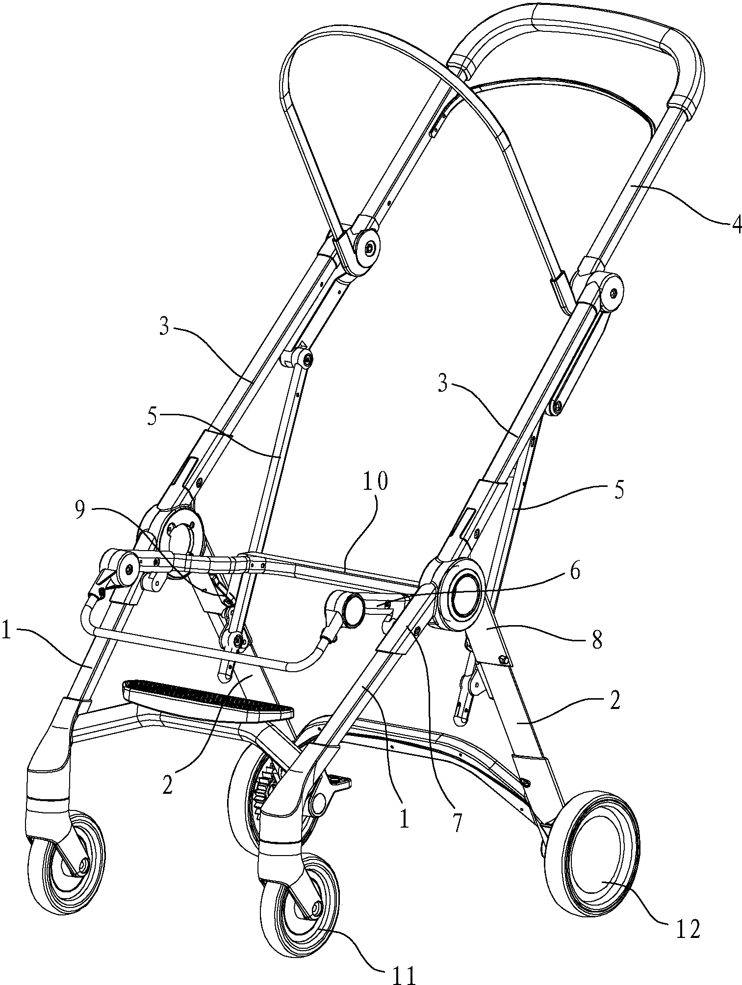 一种推车,其前支架接头与后支架接头在第一转动点形成转动连接,下推杆的下端与后支架接头在第二转动点形成转动连接,上推杆与下推杆的上端在第三转动点形成转动连接,上推杆的下端与后撑杆的上端在第四转动点形成转动连接,后撑杆的下端与后支架管在第五转动点形成转动连接,座位杆的中部与前支架接头在第六转动点形成转动连接,座位杆的后端与后撑杆在第七转动点形成转动连接。本实用新型的优点在于:该推车通过在前支架管、后支架管、下推杆、上推杆、后撑杆、座位杆、前支架接头和后支架接头之间设置七个不同位置的转动点,可以轻松实现车架的整体折叠,特别是设置拉带后,向上拉起拉带,就可以将车架解锁,此外,折叠后的车架还能保持自立。